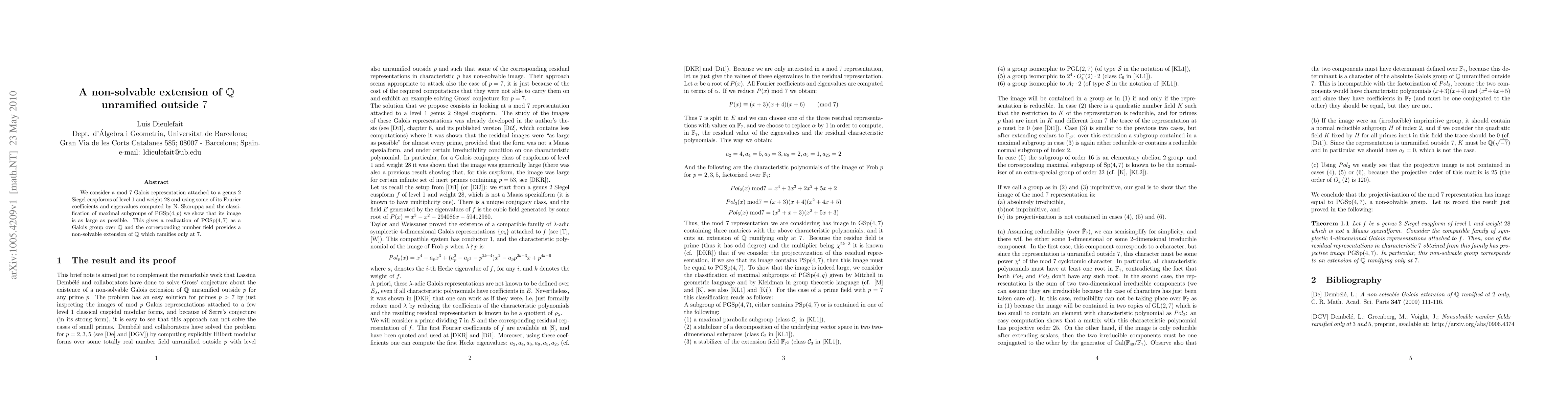 We consider a mod 7 Galois representation attached to a genus 2 Siegel cuspforms of level 1 and weight 28 and using some of its Fourier coefficients and eigenvalues computed by N. Skoruppa and the classification of maximal subgroups of PGSp(4,p) we show that its image is as large as possible. This gives a realization of PGSp(4,7) as a Galois group over $\Q$ and the corresponding number field provides a non-solvable extension of $\Q$ which ramifies only at 7.