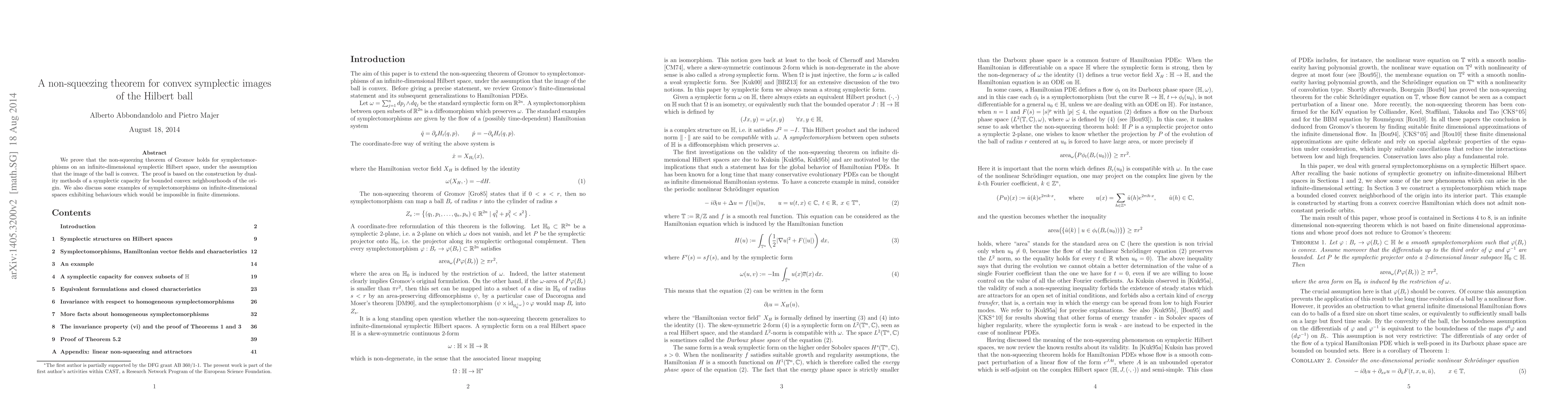 A non-squeezing theorem is proven for infinite-dimensional symplectic Hilbert spaces with convex symplectic images of the ball, allowing for behaviors impossible in finite dimensions.