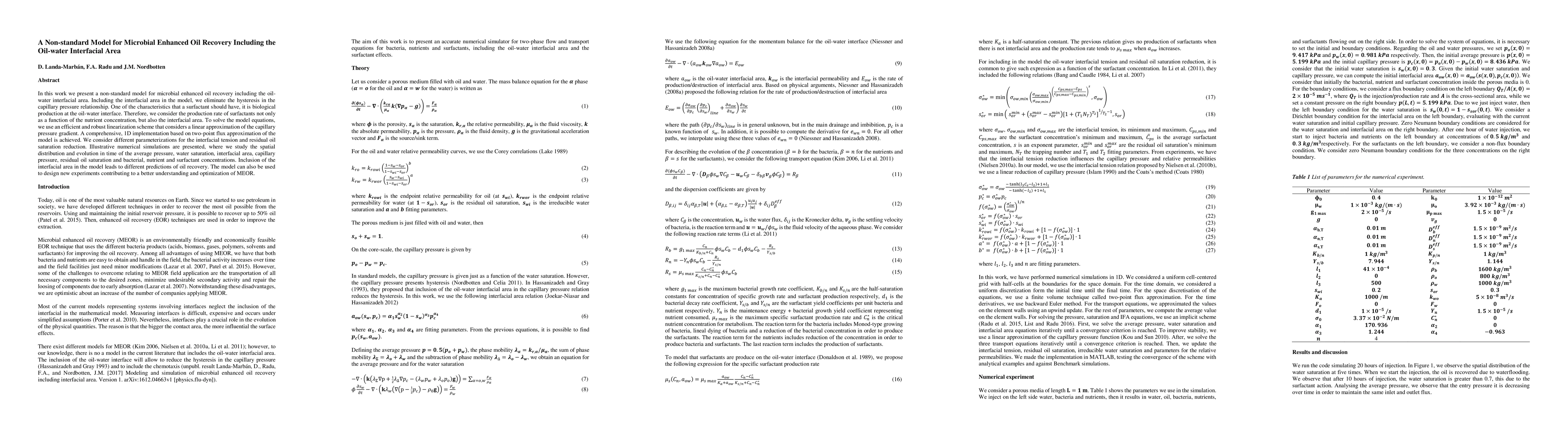 This paper proposes a non-standard model for microbial enhanced oil recovery (MEOR) that incorporates the oil-water interfacial area, eliminating hysteresis in the capillary pressure relationship. The model's linearization scheme and 1D implementation facilitate the study of various factors affecting oil recovery, providing insights for MEOR optimization and experimental design.