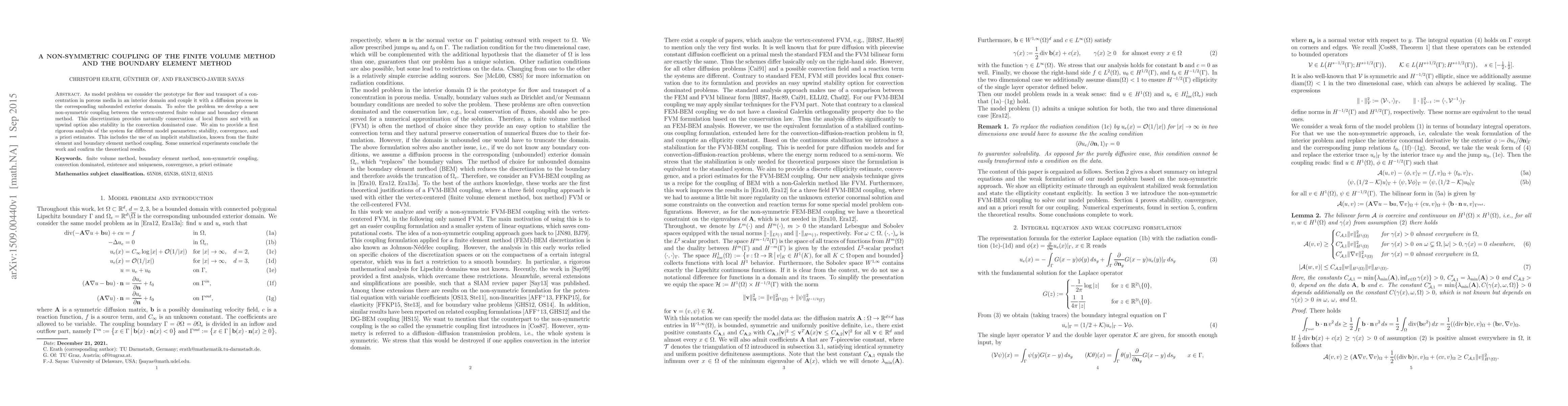 This paper develops a non-symmetric coupling between the finite volume and boundary element methods to solve flow and transport problems in porous media, ensuring conservation and stability. It provides a rigorous analysis of stability, convergence, and a priori estimates, supplemented by numerical experiments validating the theoretical results.