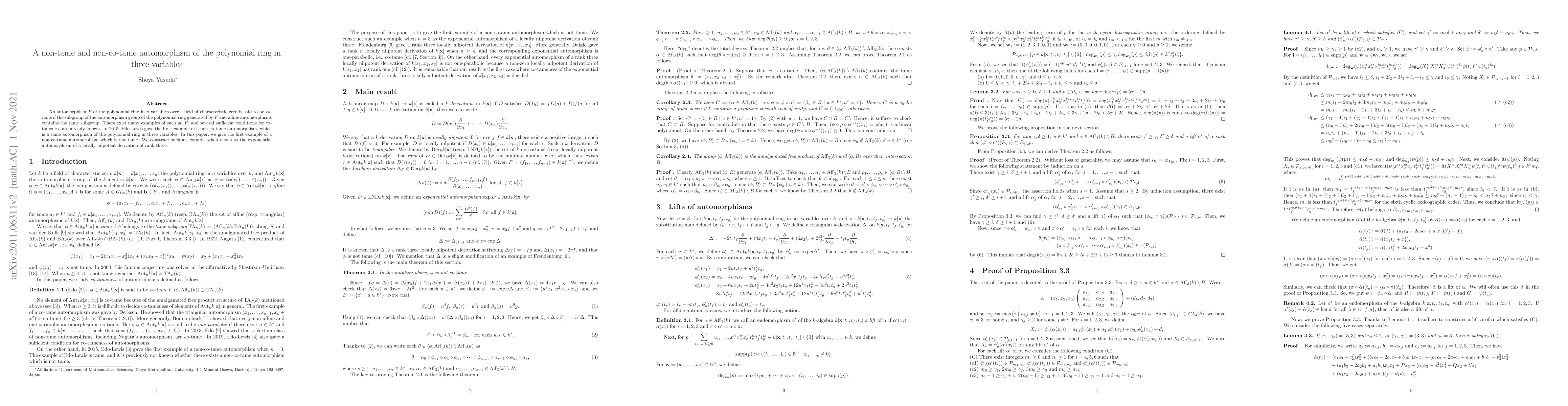 An automorphism $F$ of the polynomial ring in $n$ variables over a field of characteristic zero is said to be {\it co-tame} if the subgroup of the automorphism group of the polynomial ring generated by $F$ and affine automorphisms contains the tame subgroup. There exist many examples of such an $F$, and several sufficient conditions for co-tameness are already known. In 2015, Edo-Lewis gave the first example of a non-cotame automorphism, which is a tame automorphism of the polynomial ring in three variables. In this paper, we give the first example of a non-cotame automorphism which is not tame. We construct such an example when $n=3$ as the exponential automorphism of a locally nilpotent derivation of rank three.