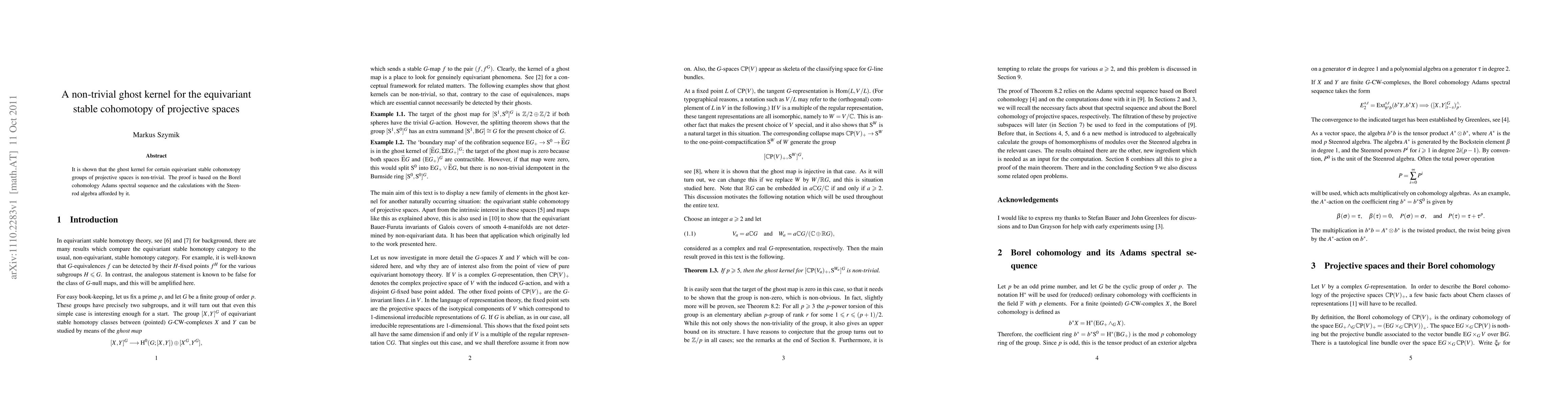 Summary: This paper demonstrates the existence of a non-trivial ghost kernel in the equivariant stable cohomotopy groups of projective spaces, utilizing the Borel cohomology Adams spectral sequence and calculations involving the Steenrod algebra.