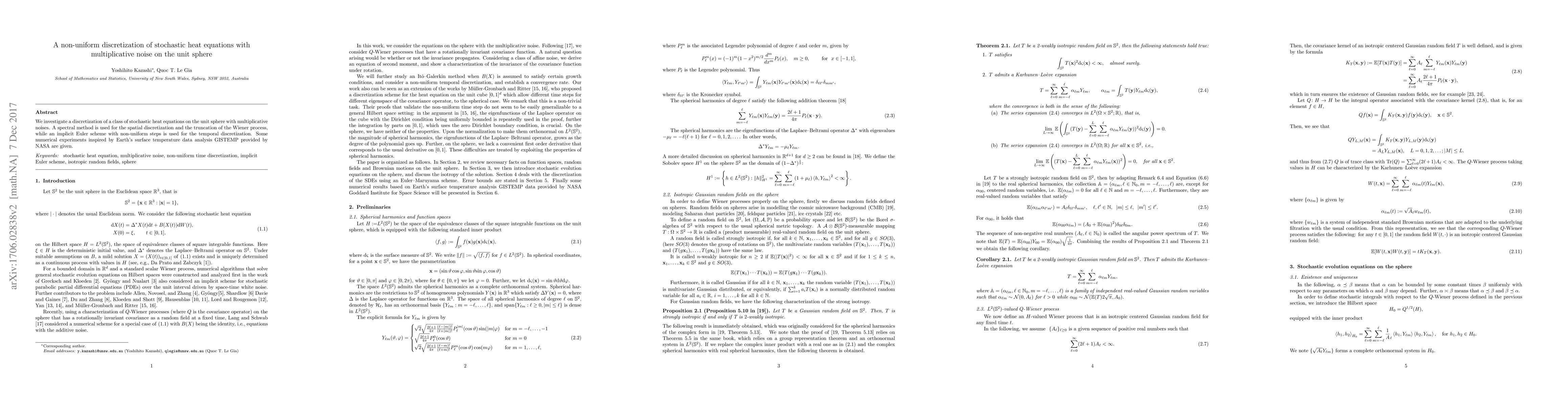This paper investigates a new discretization method for stochastic heat equations on the unit sphere with multiplicative noise, using a spectral method for spatial discretization and an implicit Euler scheme with non-uniform steps for temporal discretization.