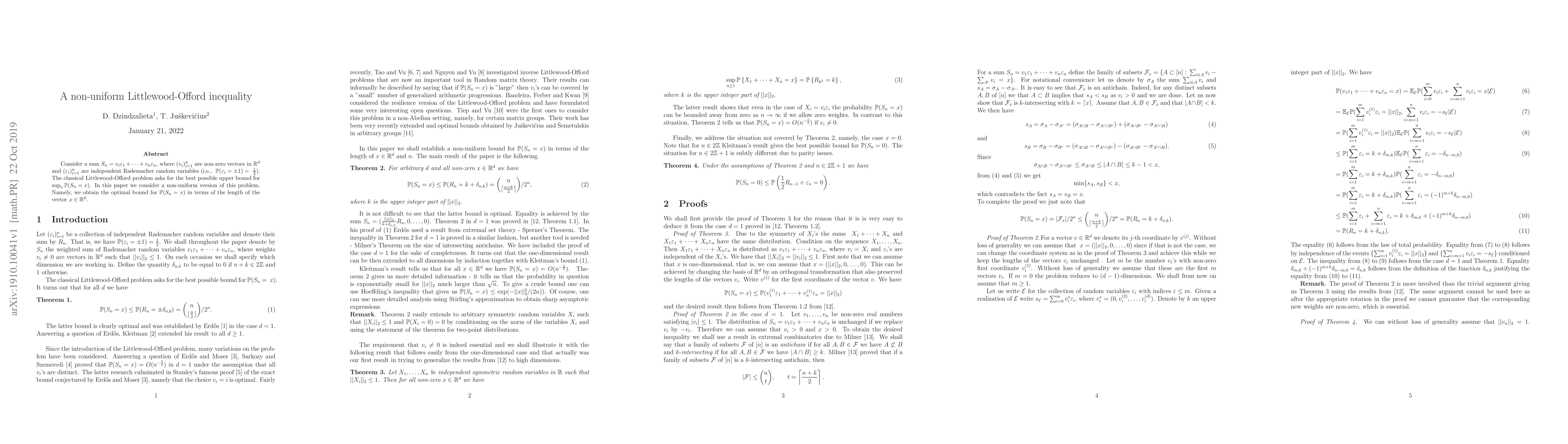 This research paper presents a non-uniform version of the Littlewood-Offord problem, providing an optimal bound for the probability of a sum of non-zero vectors with independent Rademacher random variables equalling a specific value, based on the length of that value in R^d.