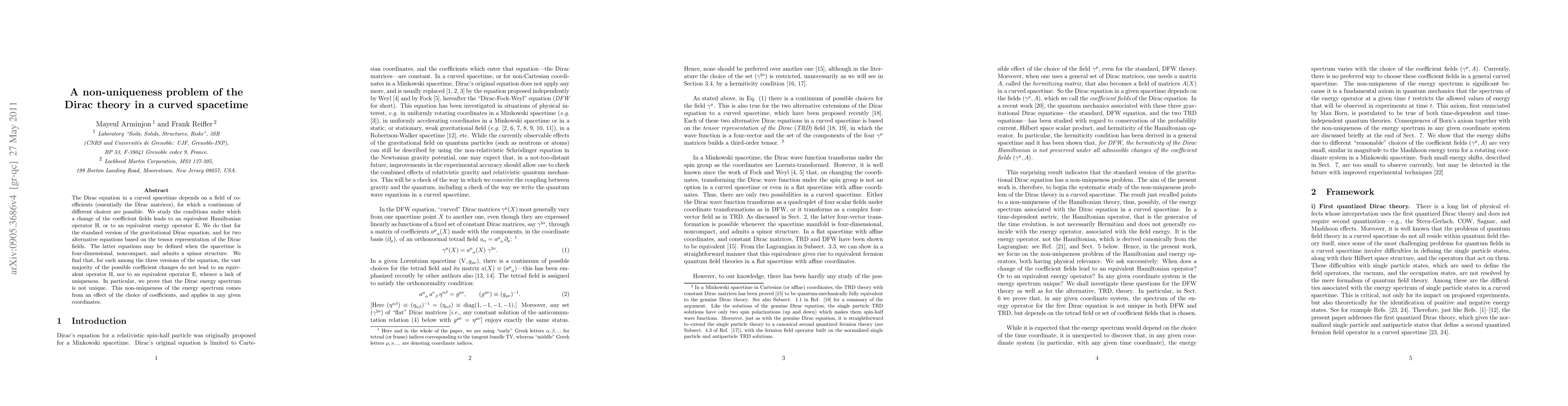This paper investigates the non-uniqueness of the Dirac theory in curved spacetime by examining various coefficient choices for the Dirac equation. It finds that most changes in coefficient fields do not yield equivalent Hamiltonian or energy operators, leading to a non-unique Dirac energy spectrum regardless of coordinate choice.