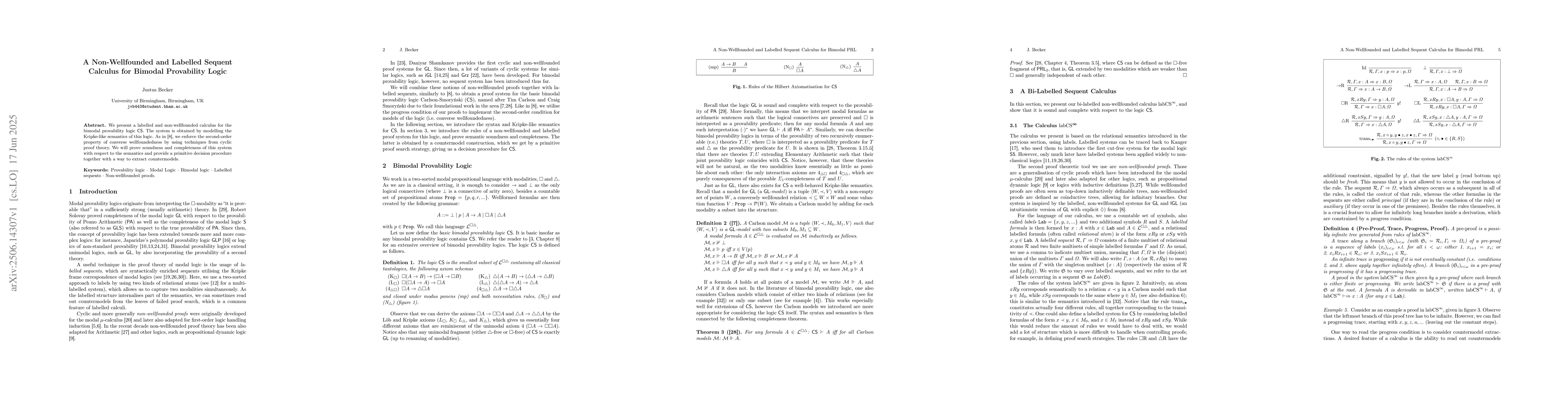 We present a labelled and non-wellfounded calculus for the bimodal provability logic CS. The system is obtained by modelling the Kripke-like semantics of this logic. As in arXiv:2309.00532, we enforce the second-order property of converse wellfoundedness by using techniques from cyclic proof theory. We will prove soundness and completeness of this system with respect to the semantics and provide a primitive decision procedure together with a way to extract countermodels.
