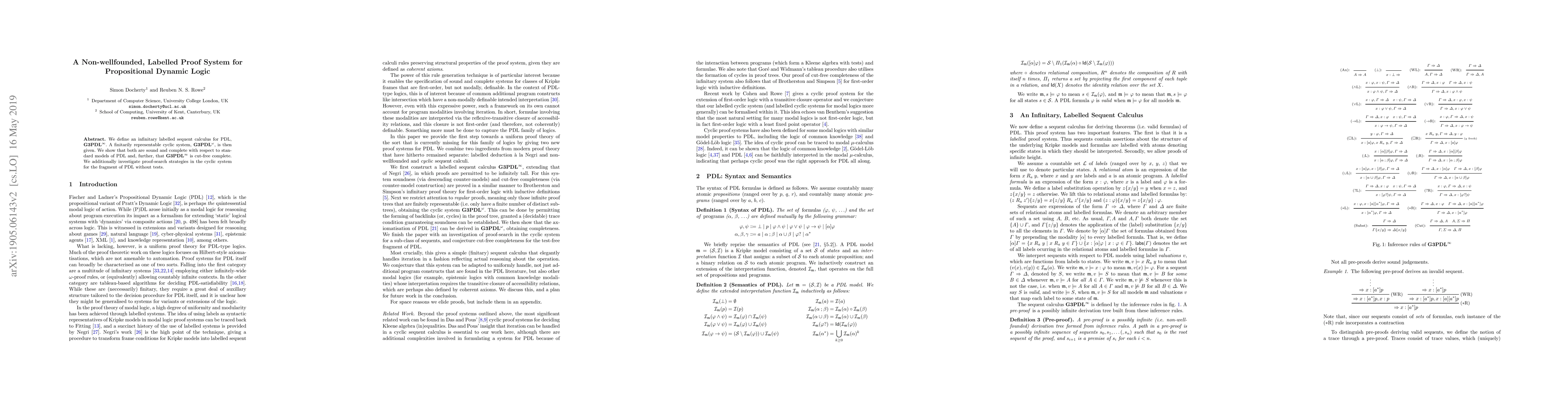 We define a infinitary labelled sequent calculus for PDL, G3PDL^{\infty}. A finitarily representable cyclic system, G3PDL^{\omega}, is then given. We show that both are sound and complete with respect to standard models of PDL and, further, that G3PDL^{\infty} is cut-free complete. We additionally investigate proof-search strategies in the cyclic system for the fragment of PDL without tests.