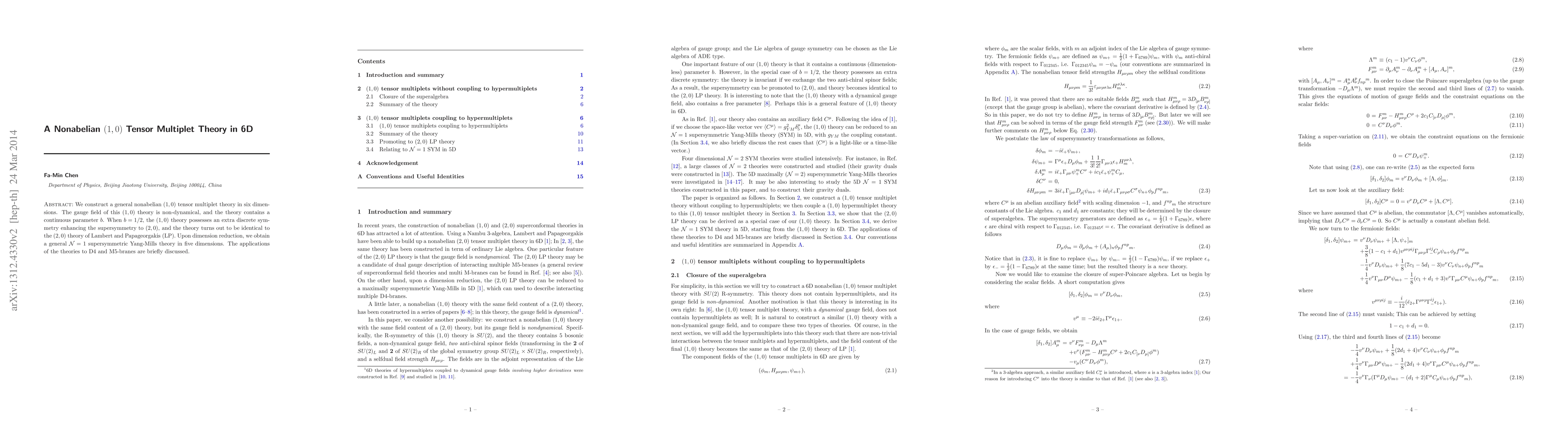 We construct a general nonabelian (1,0) tensor multiplet theory in six dimensions. The gauge field of this (1,0) theory is non-dynamical, and the theory contains a continuous parameter $b$. When $b=1/2$, the (1,0) theory possesses an extra discrete symmetry enhancing the supersymmetry to (2,0), and the theory turns out to be identical to the (2,0) theory of Lambert and Papageorgakis (LP). Upon dimension reduction, we obtain a general ${\cal N}=1$ supersymmetric Yang-Mills theory in five dimensions. The applications of the theories to D4 and M5-branes are briefly discussed.