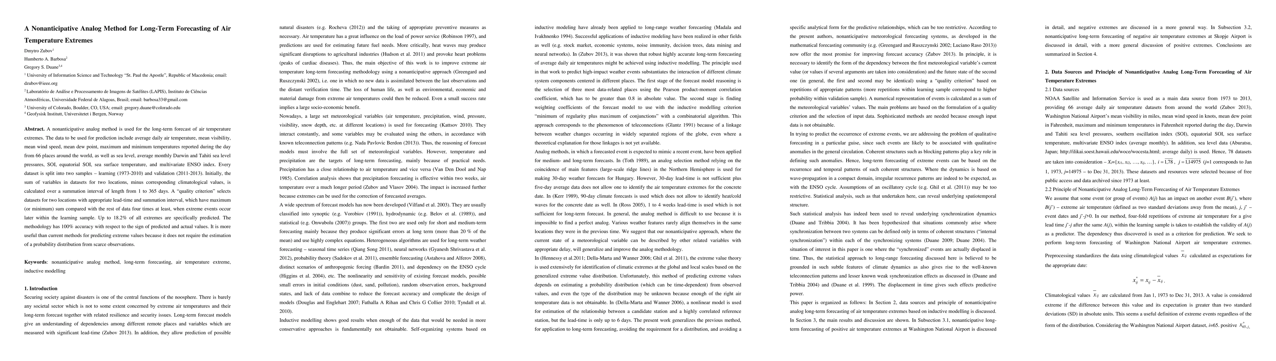 A nonanticipative analog method is used for the long-term forecast of air temperature extremes. The data to be used for prediction include average daily air temperature, mean visibility, mean wind speed, mean dew point, maximum and minimum temperatures reported during the day from 66 places around the world, as well as sea level, average monthly Darwin and Tahiti sea level pressures, SOI, equatorial SOI, sea surface temperature, and multivariate ENSO index. Every dataset is split into two samples - learning (1973-2010) and validation (2011-2013). Initially, the sum of variables in datasets for two locations, minus corresponding climatological values, is calculated over a summation interval of length from 1 to 365 days. A "quality criterion" selects datasets for two locations with appropriate lead-time and summation interval, which have maximum (or minimum) sum compared with the rest of data four times at least, when extreme events occur later within the learning sample. Up to 18.2% of all extremes are specifically predicted. The methodology has 100% accuracy with respect to the sign of predicted and actual values. It is more useful than current methods for predicting extreme values because it does not require the estimation of a probability distribution from scarce observations.