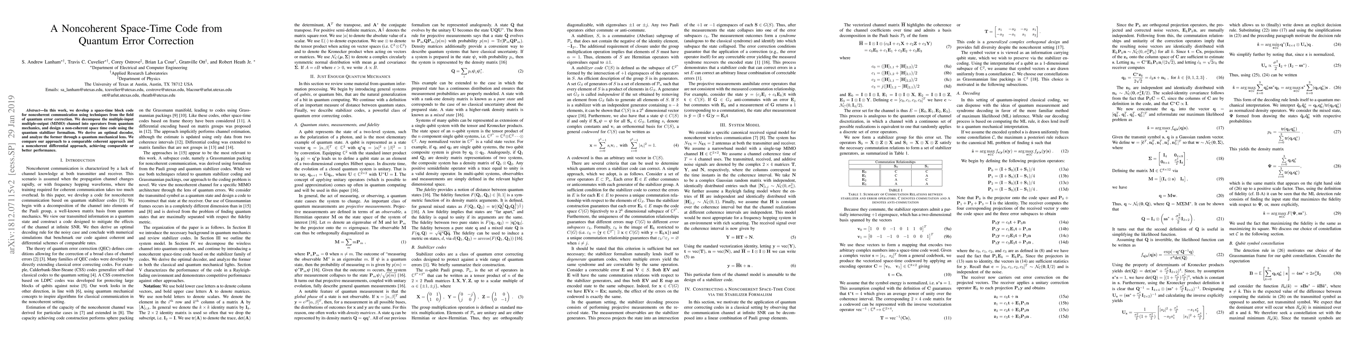 Researchers developed a space-time block code for noncoherent communication using quantum error correction techniques, achieving comparable or better performance than existing methods.