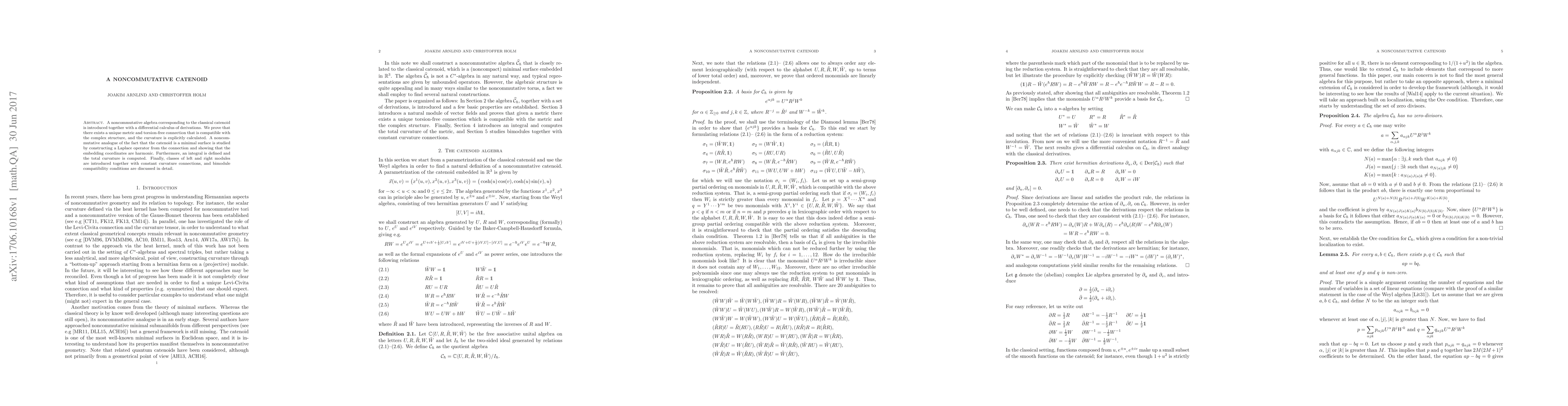 This paper introduces a noncommutative catenoid with a unique metric and torsion-free connection compatible with its complex structure, and explores properties such as minimal surface, harmonic embedding coordinates, and constant curvature connections.