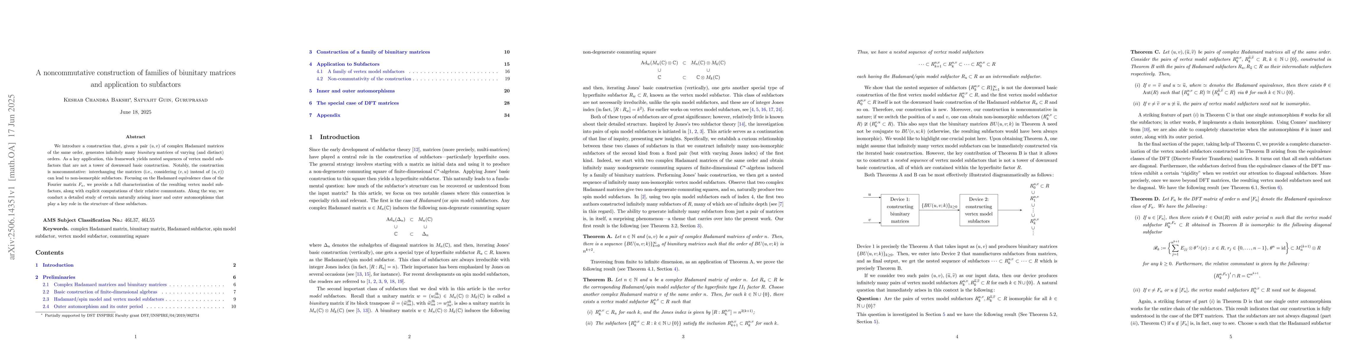 We introduce a construction that, given a pair (u,v) of complex Hadamard matrices of the same order, generates infinitely many biunitary matrices of varying (and distinct) orders. As a key application, this framework yields nested sequences of vertex model subfactors that are not a tower of downward basic construction. Notably, the construction is noncommutative: interchanging the matrices (i.e., considering (v,u) instead of (u,v)) can lead to non-isomorphic subfactors. Focusing on the Hadamard equivalence class of the Fourier matrix, we provide a full characterization of the resulting vertex model subfactors, along with explicit computations of their relative commutants. Along the way, we conduct a detailed study of certain naturally arising inner and outer automorphisms that play a key role in the structure of these subfactors.