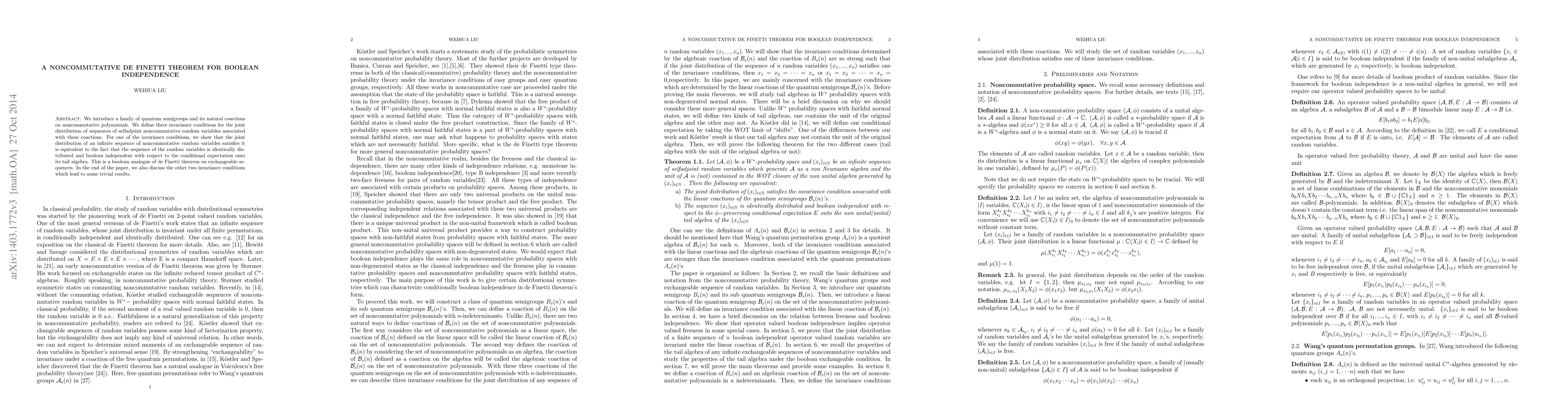 The introduction of quantum semigroup coactions on noncommutative polynomials and the associated invariance conditions for boolean independence, along with the proof of a noncommutative De Finetti theorem.