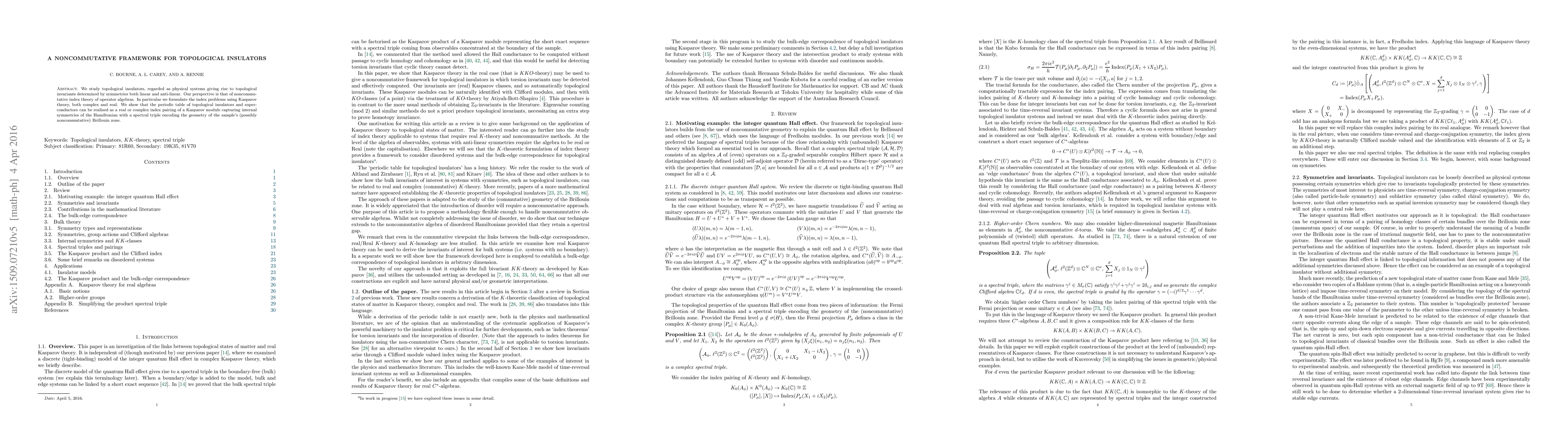 This paper develops a noncommutative framework for topological insulators using Kasparov theory, showing that the classification of topological insulators and superconductors can be realized through index pairings of Kasparov modules and spectral triples. The approach captures internal symmetries and the geometry of the Brillouin zone, potentially in noncommutative settings.