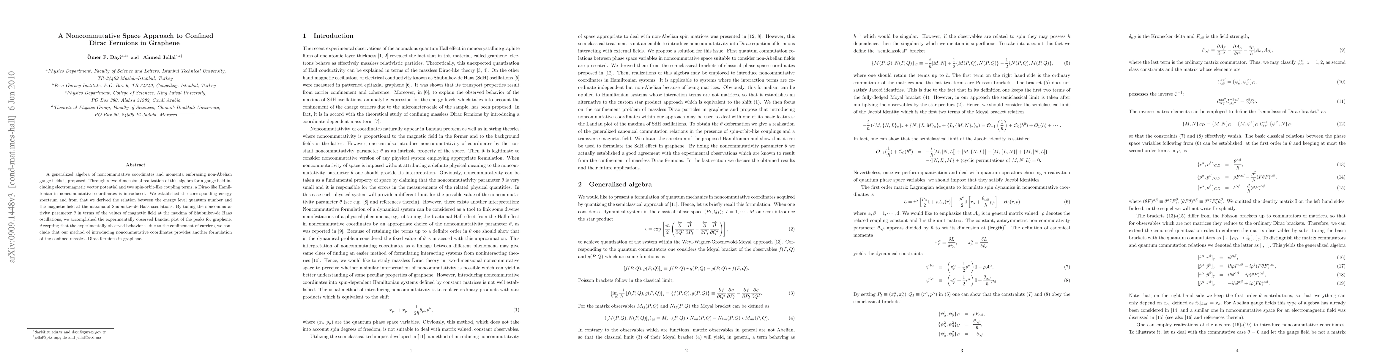 A generalized algebra of noncommutative coordinates and momenta embracing non-Abelian gauge fields is proposed. Through a two-dimensional realization of this algebra for a gauge field including electromagnetic vector potential and two spin-orbit-like coupling terms, a Dirac-like Hamiltonian in noncommutative coordinates is introduced. We established the corresponding energy spectrum and from that we derived the relation between the energy level quantum number and the magnetic field at the maxima of Shubnikov-de Haas oscillations. By tuning the non-commutativity parameter \theta in terms of the values of magnetic field at the maxima of Shubnikov-de Haas oscillations we accomplished the experimentally observed Landau plot of the peaks for graphene. Accepting that the experimentally observed behavior is due to the confinement of carriers, we conclude that our method of introducing noncommutative coordinates provides another formulation of the confined massless Dirac fermions in graphene.
