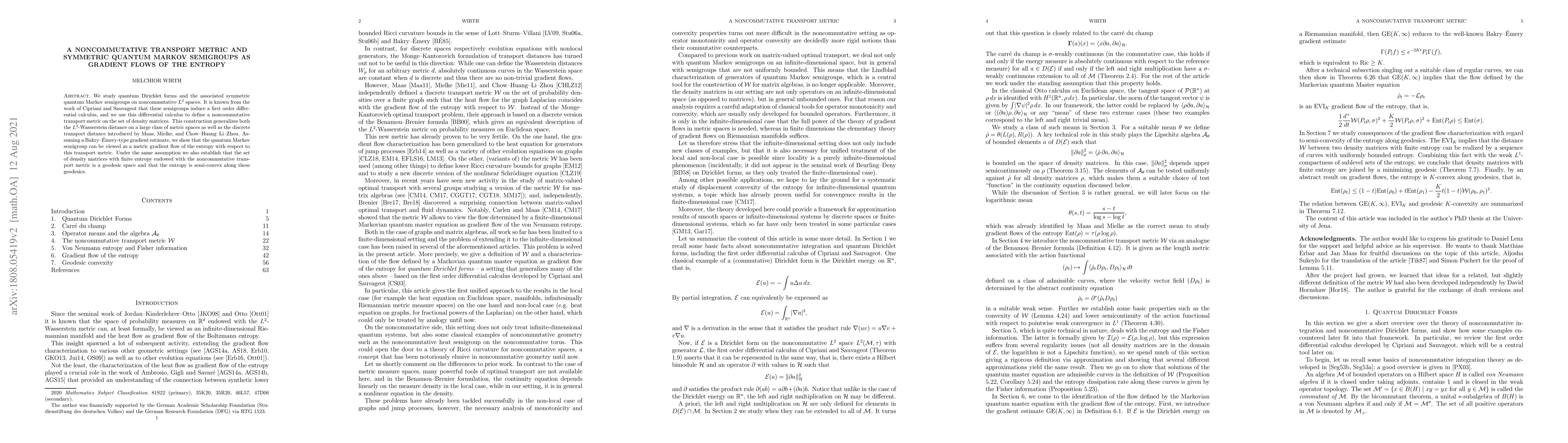 We study quantum Dirichlet forms and the associated symmetric quantum Markov semigroups on noncommutative $L^2$ spaces. It is known from the work of Cipriani and Sauvageot that these semigroups induce a first order differential calculus, and we use this differential calculus to define a noncommutative transport metric on the set of density matrices. This construction generalizes both the $L^2$-Wasserstein distance on a large class of metric spaces as well as the discrete transport distance introduced by Maas, Mielke, and Chow-Huang-Li-Zhou. Assuming a Bakry-\'Emery-type gradient estimate, we show that the quantum Markov semigroup can be viewed as a metric gradient flow of the entropy with respect to this transport metric. Under the same assumption we also establish that the set of density matrices with finite entropy endowed with the noncommutative transport metric is a geodesic space and that the entropy is semi-convex along these geodesics.