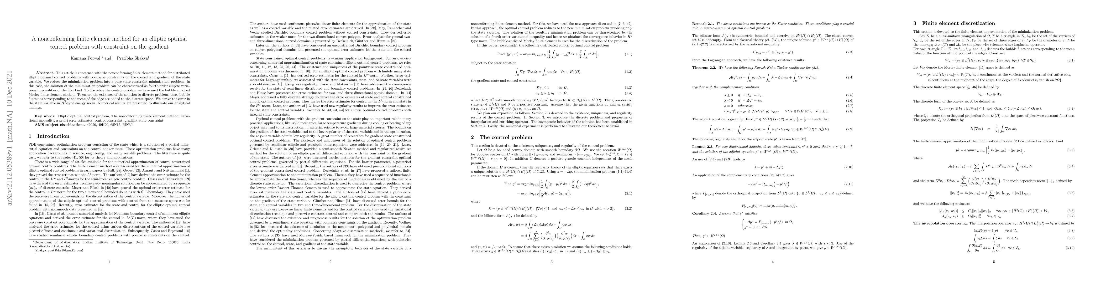 This paper develops a nonconforming finite element method for elliptic optimal control problems with constraints on both control and state gradient. It employs the bubble enriched Morley finite element method and proves the existence of solutions, deriving $H^2$-type error estimates, and presents numerical results to validate the theoretical findings.
