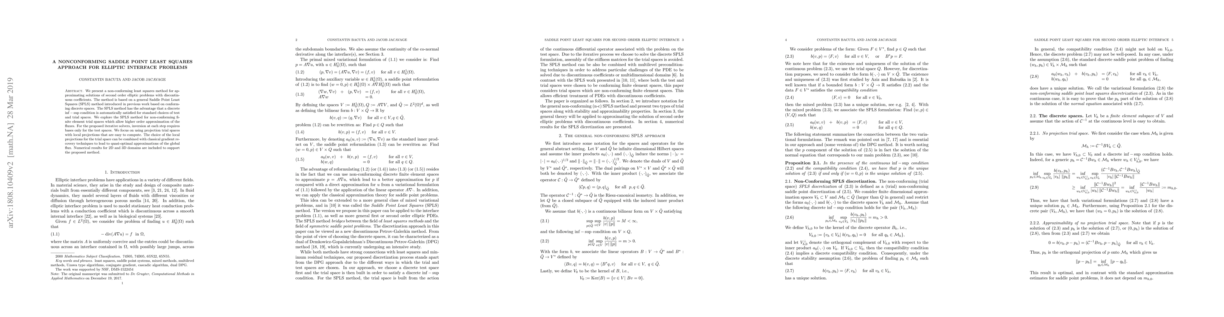 This paper introduces a nonconforming Saddle Point Least Squares (SPLS) method for solving second-order elliptic problems with discontinuous coefficients. The SPLS method leverages non-conforming finite element spaces to achieve higher order flux approximations, and numerical results demonstrate its effectiveness in 2D and 3D domains.