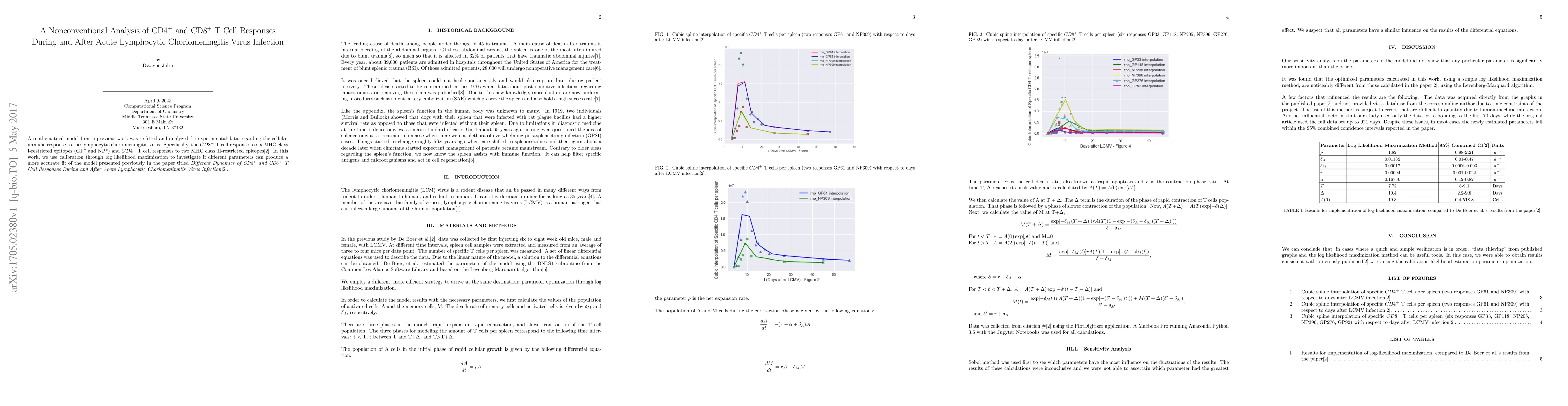 A mathematical model from a previous work was re-fitted and analyzed for experimental data regarding the cellular immune response to the lymphocytic choriomeningitis virus. Specifically, the $CD8^{+}$ T cell response to six MHC class I-restricted epitopes (GP* and NP*) and $CD4^{+}$ T cell responses to two MHC class II-restricted epitopes\cite{de2003different}. In this work, we use calibration through log likelihood maximization to investigate if different parameters can produce a more accurate fit of the model presented previously in the paper titled \textit{Different Dynamics of CD$4^{+}$ and CD$8^{+}$ T Cell Responses During and After Acute Lymphocytic Choriomeningitis Virus Infection}\cite{de2003different}