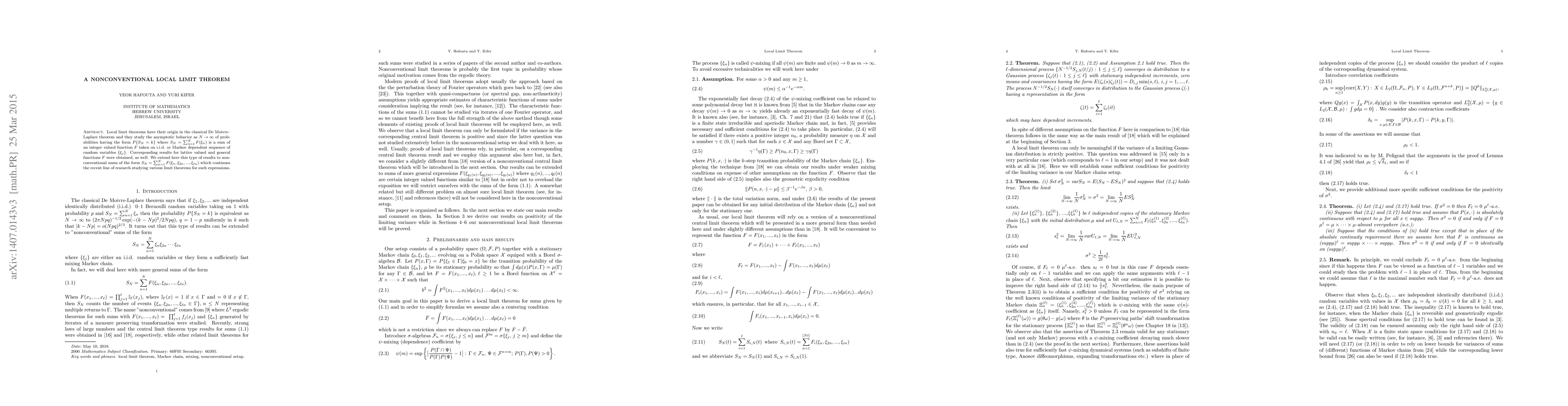 Summary: This paper extends the local limit theorem to nonconventional sums involving multiple terms, specifically $S_N=\sum_{n=1}^NF(\xi_n,\xi_{2n},...,\xi_{\ell n})$. The results provide new insights into the distributional behavior of such complex sum structures.