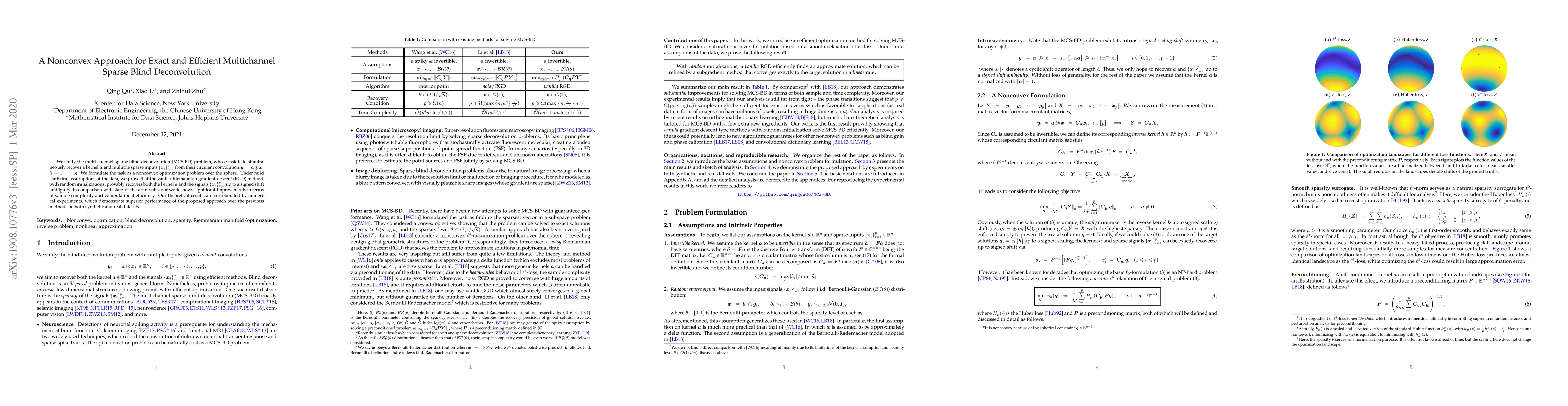 This paper proposes a nonconvex optimization approach for solving the multi-channel sparse blind deconvolution problem, achieving exact recovery of the kernel and sparse inputs with improved sample complexity and computational efficiency. Theoretical guarantees and numerical experiments show superior performance compared to existing methods.