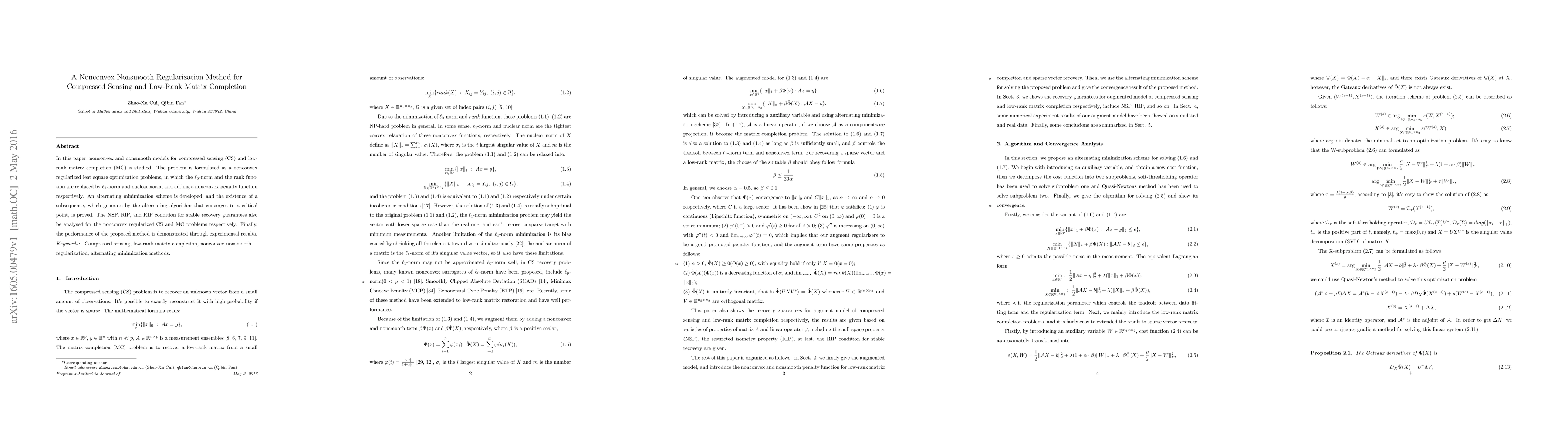 This paper proposes a nonconvex nonsmooth regularization method for compressed sensing and low-rank matrix completion, replacing l0-norm and rank functions with l1-norm and nuclear norm, and introducing a nonconvex penalty function. An alternating minimization scheme is developed and proven to converge to a critical point, with theoretical guarantees analyzed for stable recovery. Experimental results validate the method's performance.