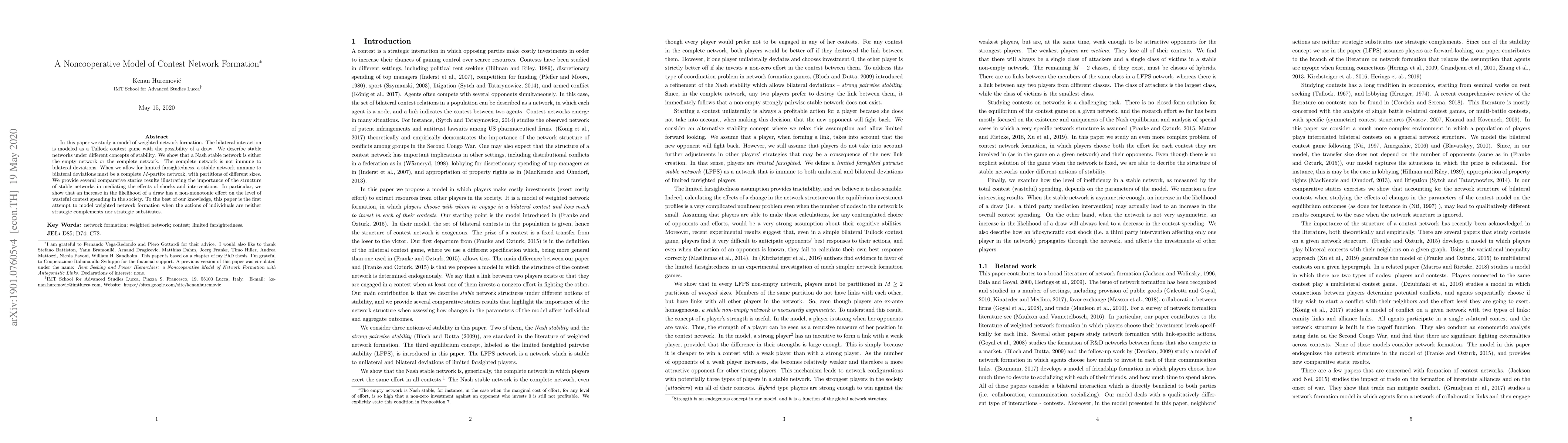 In this paper we study a model of weighted network formation. The bilateral interaction is modeled as a Tullock contest game with the possibility of a draw. We describe stable networks under different concepts of stability. We show that a Nash stable network is either the empty network or the complete network. The complete network is not immune to bilateral deviations. When we allow for limited farsightedness, stable networks immune to bilateral deviations must be complete $M$-partite networks, with partitions of different sizes. The empty network is the efficient network. We provide several comparative statics results illustrating the importance of network structure in mediating the effects of shocks and interventions. In particular, we show that an increase in the likelihood of a draw has a non-monotonic effect on the level of wasteful contest spending in the society. To the best of our knowledge, this paper is the first attempt to model weighted network formation when the actions of individuals are neither strategic complements nor strategic substitutes.