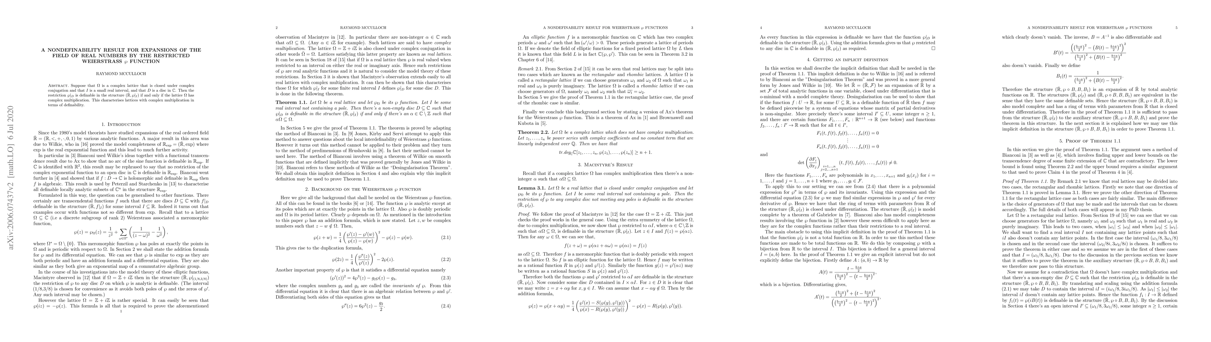 Suppose that $\Omega$ is a complex lattice that is closed under complex conjugation and that $I$ is a small real interval, and that $D$ is a disc in $ \mathbb{C}$. Then the restriction $\wp|_D$ is definable in the structure $(\bar{\mathbb{R}},\wp|_I)$ if and only if the lattice $\Omega$ has complex multiplication. This characterises lattices with complex multiplication in terms of definability.