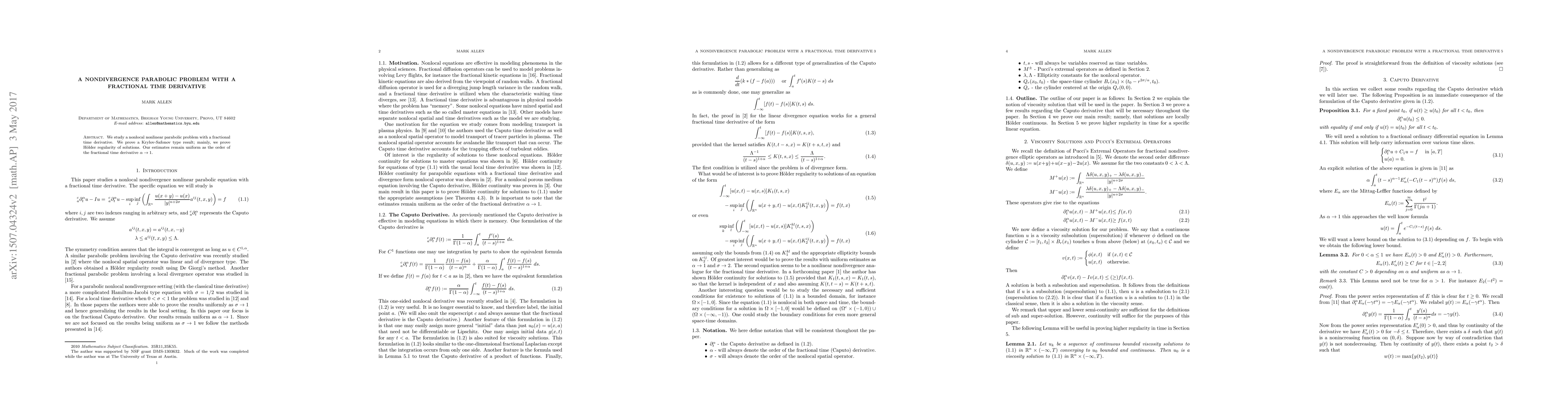 This paper investigates a nonlocal nonlinear parabolic problem featuring a fractional time derivative, proving Holder regularity of solutions and demonstrating uniform estimates as the fractional derivative approaches a first-order derivative.