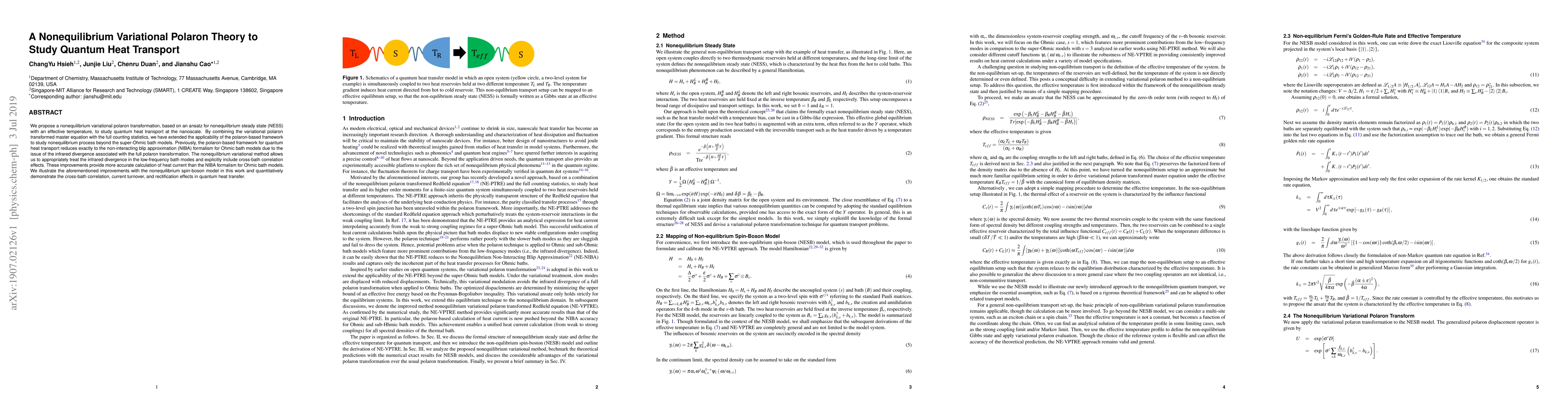 This paper introduces a nonequilibrium variational polaron transformation to study quantum heat transport at the nanoscale, addressing the infrared divergence issue and cross-bath correlation effects. The method provides more accurate heat current calculations compared to the non-interacting blip approximation, demonstrated through the nonequilibrium spin-boson model.