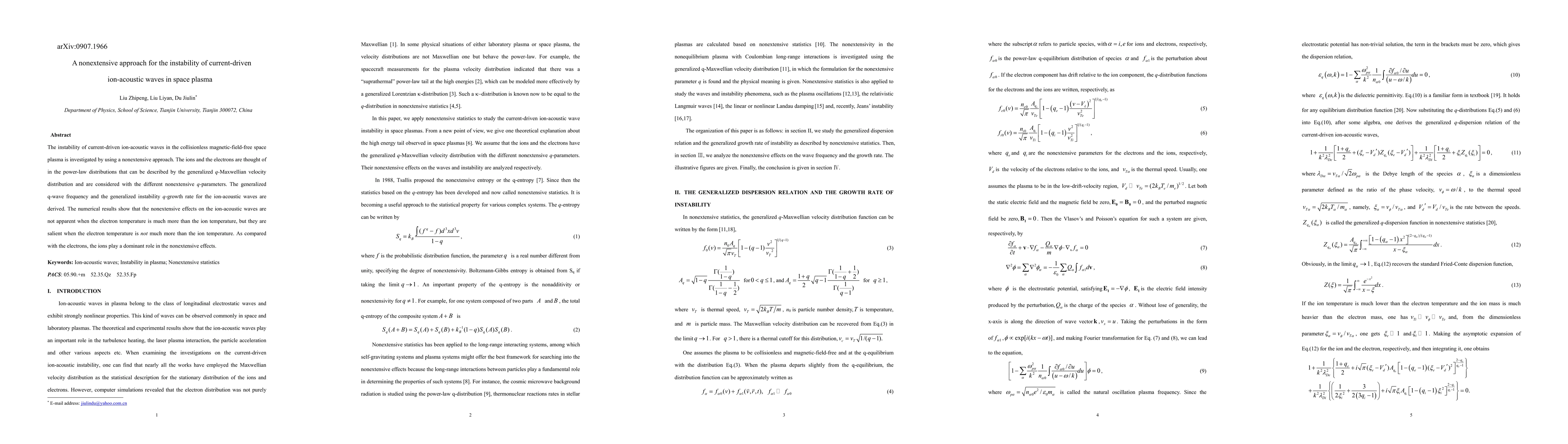 This paper explores the instability of current-driven ion-acoustic waves in space plasma using a nonextensive approach, deriving generalized q-wave frequency and q-growth rate. Nonextensive effects are significant when electron and ion temperatures are comparable, with ions playing a dominant role.