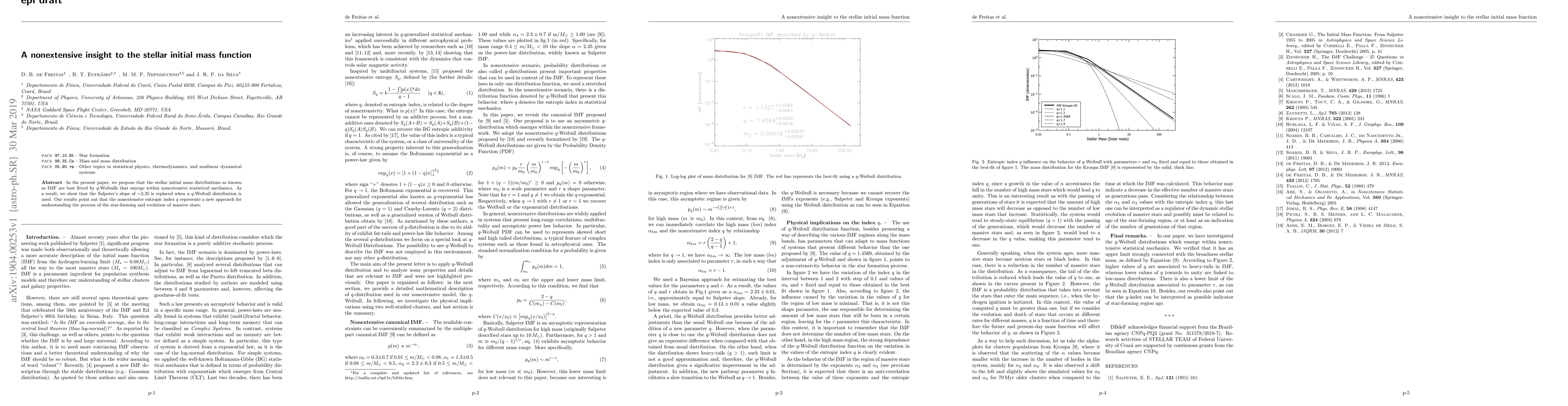 the present paper, we propose that the stellar initial mass distributions as known as IMF are best fitted by $q$-Weibulls that emerge within nonextensive statistical mechanics. As a result, we show that the Salpeter's slope of $\sim$2.35 is replaced when a $q$-Weibull distribution is used. Our results point out that the nonextensive entropic index $q$ represents a new approach for understanding the process of the star-forming and evolution of massive stars.