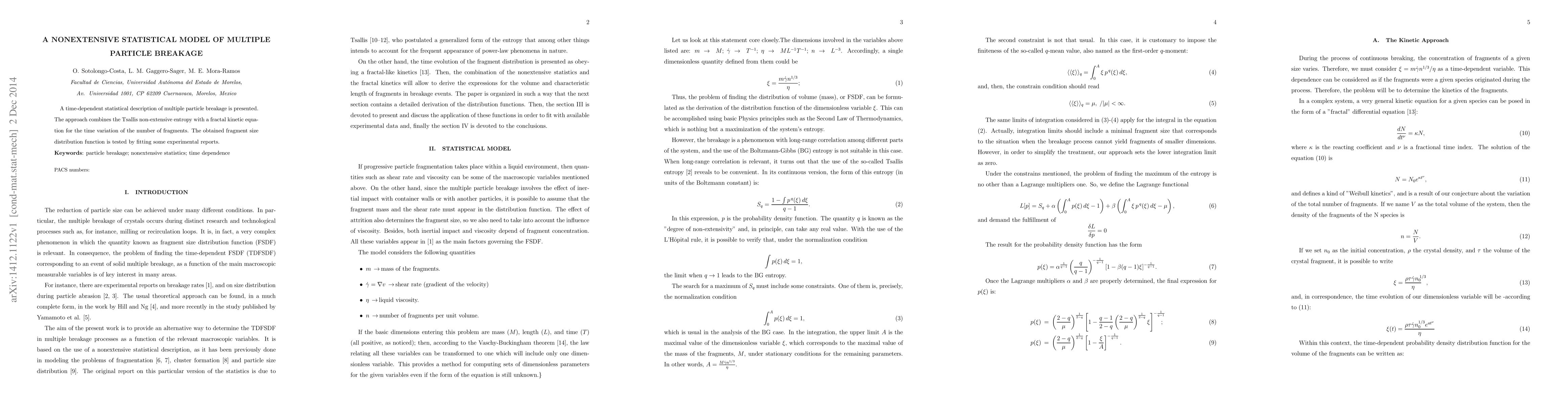 A time-dependent statistical description of multiple particle breakage is presented. The approach combines the Tsallis non-extensive entropy with a fractal kinetic equation for the time variation of the number of fragments. The obtained fragment size distribution function is tested by fitting some experimental reports.