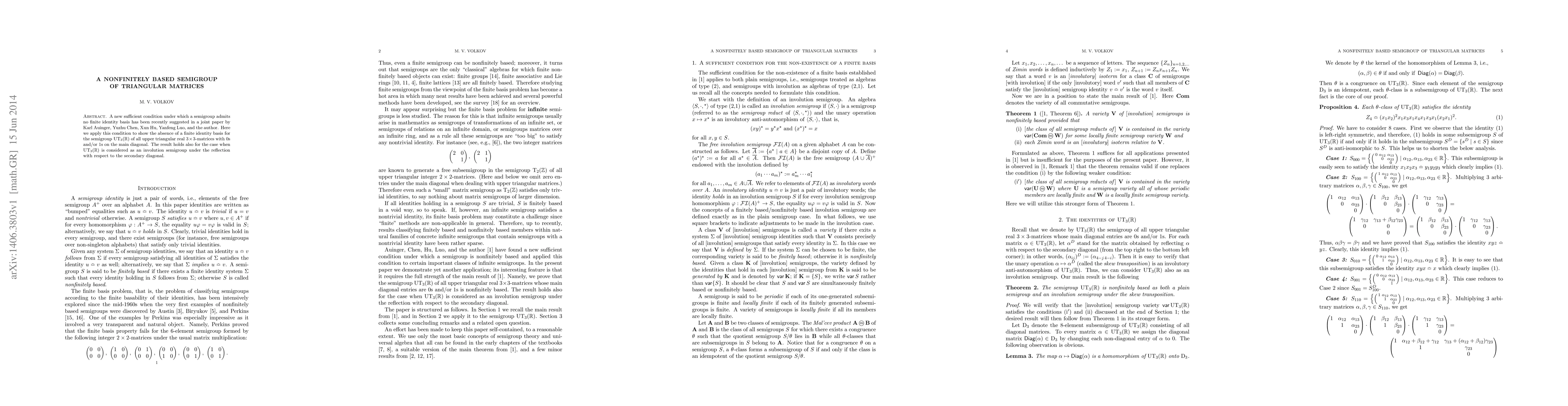 A new sufficient condition under which a semigroup admits no finite identity basis has been recently suggested in a joint paper by Karl Auinger, Yuzhu Chen, Xun Hu, Yanfeng Luo, and the author (see http://arxiv.org/abs/1405.0783). Here we apply this condition to show the absence of a finite identity basis for the semigroup $\mathrm{UT}_3(\mathbb{R})$ of all upper triangular real $3\times 3$-matrices with 0s and/or 1s on the main diagonal. The result holds also for the case when $\mathrm{UT}_3(\mathbb{R})$ is considered as an involution semigroup under the reflection with respect to the secondary diagonal.