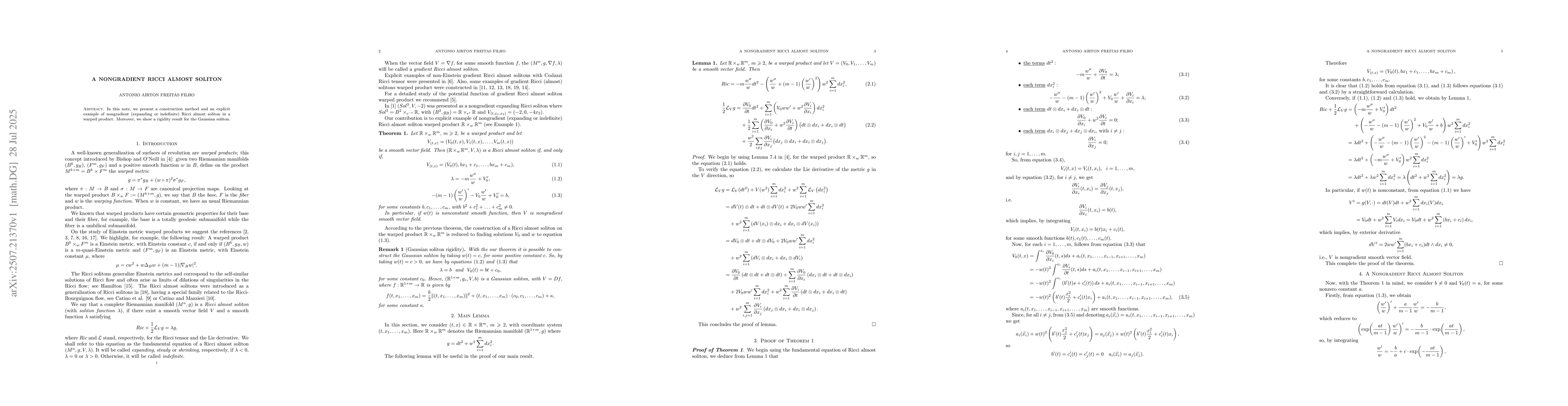 In this note, we present a construction method and an explicit example of nongradient (expanding or indefinite) Ricci almost soliton in a warped product. Moreover, we show a rigidity result for the Gaussian soliton.