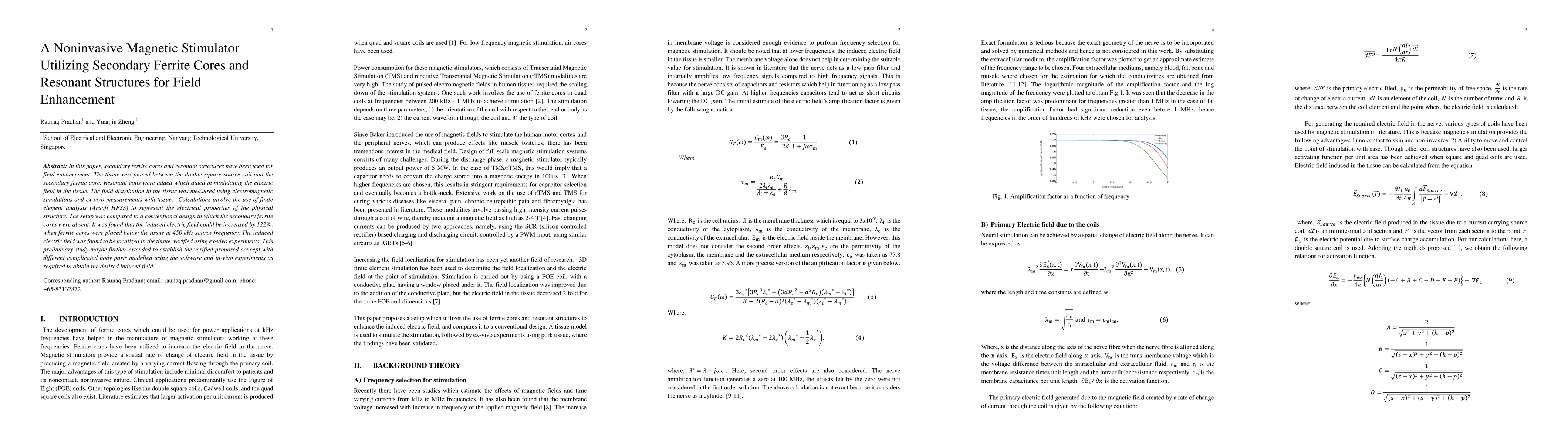 Researchers developed a noninvasive magnetic stimulator that increases induced electric field in tissue by 122% using secondary ferrite cores and resonant structures at 450 kHz source frequency.