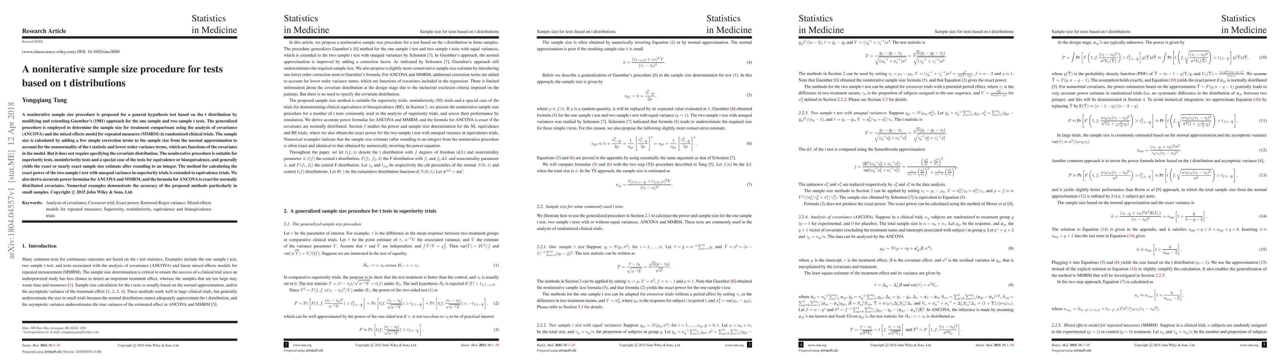This paper proposes a noniterative sample size procedure for hypothesis tests based on t distributions, extending Guenther's approach for normal approximations. The method accurately determines sample sizes for ANCOVA and MMRM in clinical trials, with exact or nearly exact estimates, and is applicable to superiority, noninferiority, and equivalence tests.