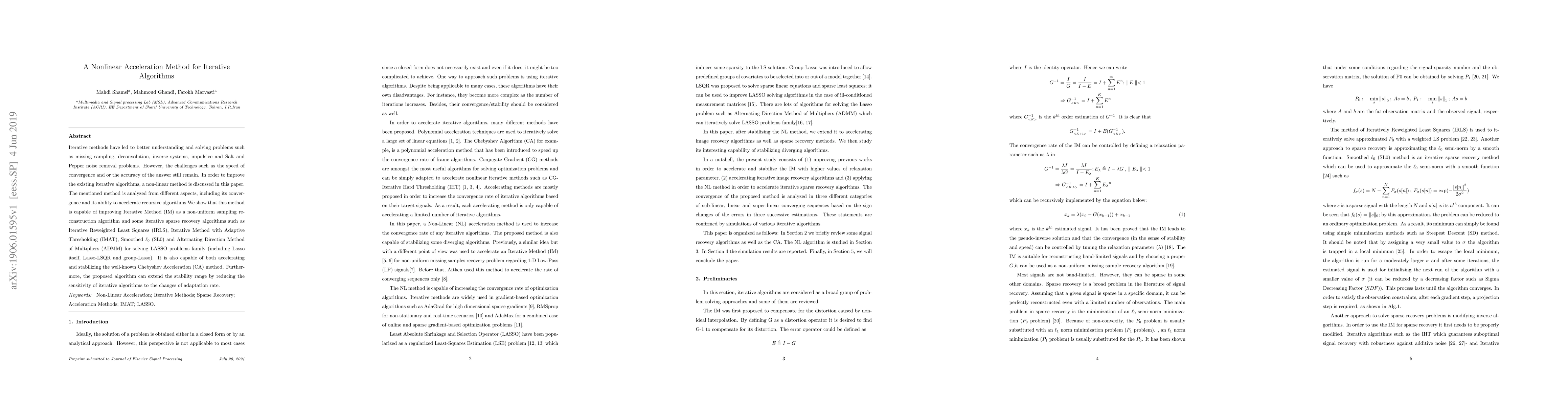 A new nonlinear acceleration method is proposed to improve the convergence speed and accuracy of iterative algorithms for solving various problems like noise removal and sparse recovery. The method accelerates recursive algorithms while stabilizing their performance.
