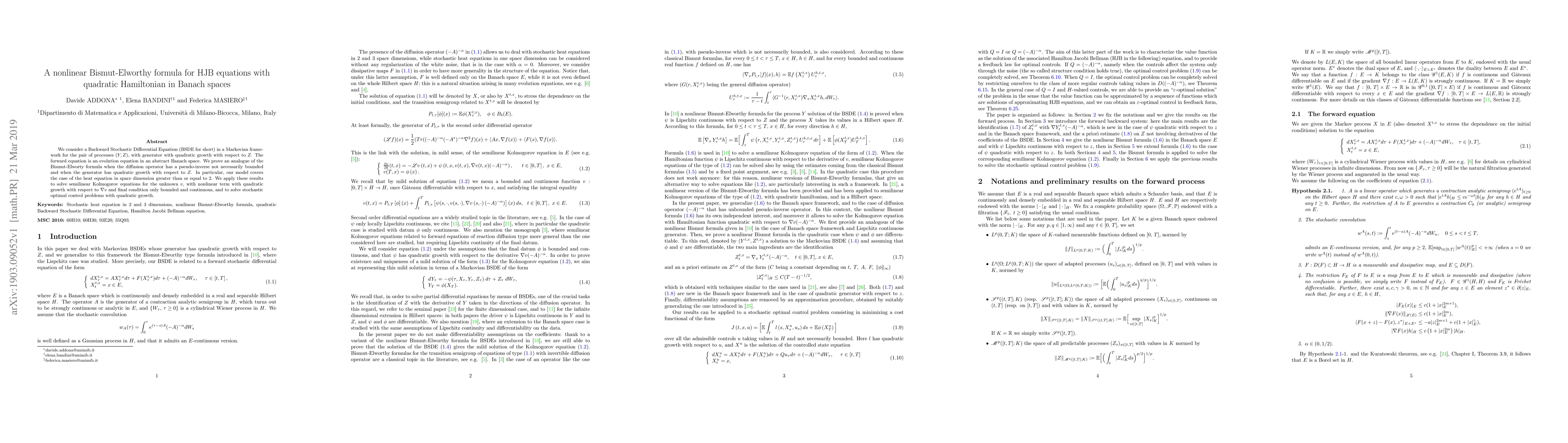We consider a Backward Stochastic Differential Equation (BSDE for short) in a Markovian framework for the pair of processes $(Y,Z)$, with generator with quadratic growth with respect to $Z$. The forward equation is an evolution equation in an abstract Banach space. We prove an analogue of the Bismut-Elworty formula when the diffusion operator has a pseudo-inverse not necessarily bounded and when the generator has quadratic growth with respect to $Z$. In particular, our model covers the case of the heat equation in space dimension greater than or equal to 2. We apply these results to solve semilinear Kolmogorov equations for the unknown $v$, with nonlinear term with quadratic growth with respect to $\nabla v$ and final condition only bounded and continuous, and to solve stochastic optimal control problems with quadratic growth.