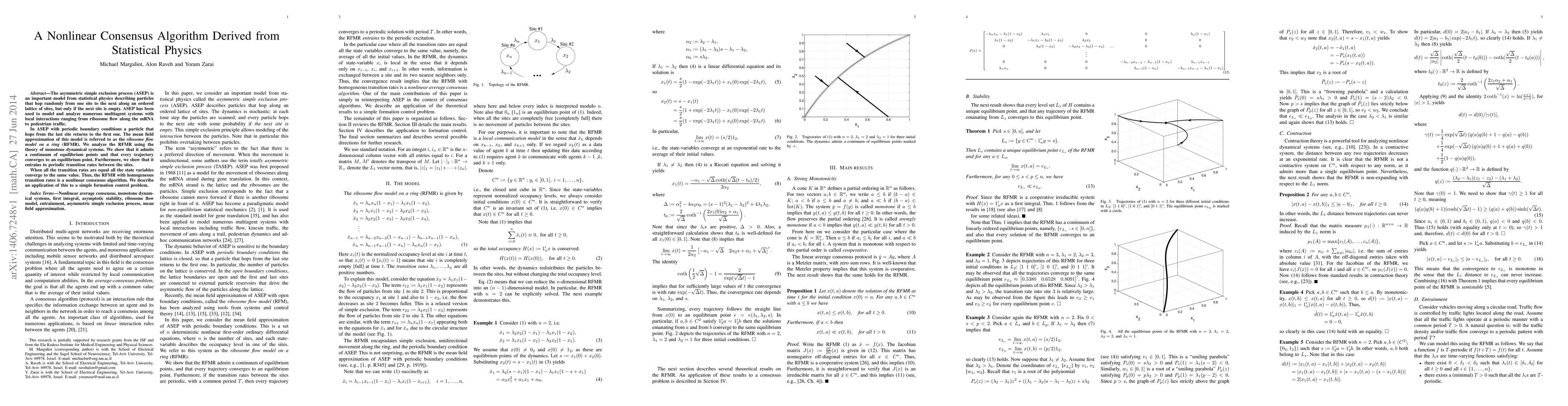 The asymmetric simple exclusion process (ASEP) is an important model from statistical physics describing particles that hop randomly from one site to the next along an ordered lattice of sites, but only if the next site is empty. ASEP has been used to model and analyze numerous multiagent systems with local interactions ranging from ribosome flow along the mRNA to pedestrian traffic. In ASEP with periodic boundary conditions a particle that hops from the last site returns to the first one. The mean field approximation of this model is referred to as the ribosome flow model on a ring (RFMR). We analyze the RFMR using the theory of monotone dynamical systems. We show that it admits a continuum of equilibrium points and that every trajectory converges to an equilibrium point. Furthermore, we show that it entrains to periodic transition rates between the sites. When all the transition rates are equal all the state variables converge to the same value. Thus, the RFMR with homogeneous transition rates is a nonlinear consensus algorithm. We describe an application of this to a simple formation control problem.