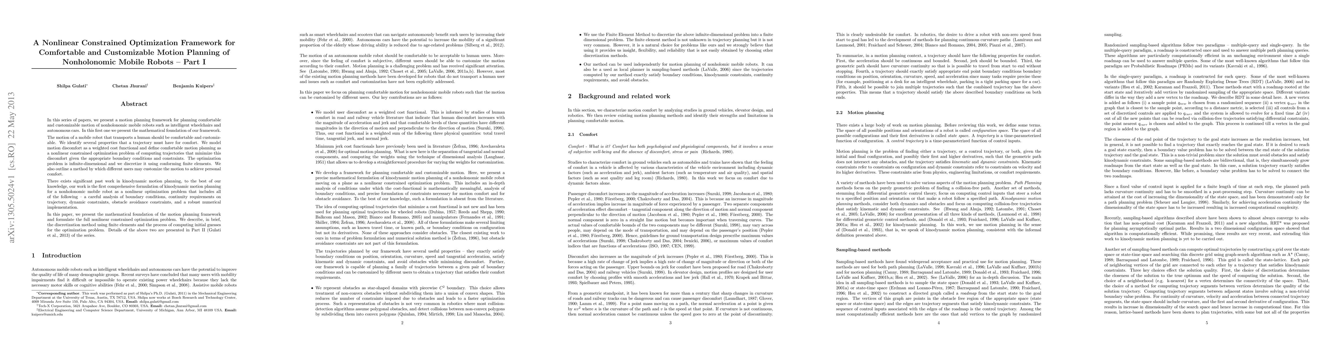 In this series of papers, we present a motion planning framework for planning comfortable and customizable motion of nonholonomic mobile robots such as intelligent wheelchairs and autonomous cars. In this first one we present the mathematical foundation of our framework. The motion of a mobile robot that transports a human should be comfortable and customizable. We identify several properties that a trajectory must have for comfort. We model motion discomfort as a weighted cost functional and define comfortable motion planning as a nonlinear constrained optimization problem of computing trajectories that minimize this discomfort given the appropriate boundary conditions and constraints. The optimization problem is infinite-dimensional and we discretize it using conforming finite elements. We also outline a method by which different users may customize the motion to achieve personal comfort. There exists significant past work in kinodynamic motion planning, to the best of our knowledge, our work is the first comprehensive formulation of kinodynamic motion planning for a nonholonomic mobile robot as a nonlinear optimization problem that includes all of the following - a careful analysis of boundary conditions, continuity requirements on trajectory, dynamic constraints, obstacle avoidance constraints, and a robust numerical implementation. In this paper, we present the mathematical foundation of the motion planning framework and formulate the full nonlinear constrained optimization problem. We describe, in brief, the discretization method using finite elements and the process of computing initial guesses for the optimization problem. Details of the above two are presented in Part II of the series.