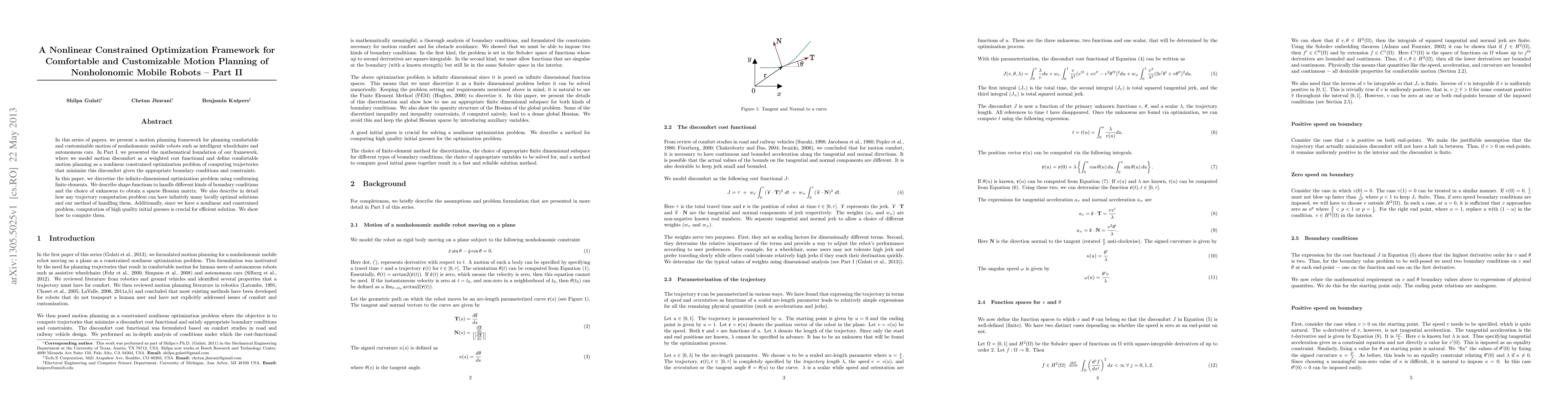 This paper presents a discretization method for a nonlinear constrained optimization framework to plan comfortable and customizable motion for nonholonomic mobile robots. It uses conforming finite elements, shape functions, and a sparse Hessian matrix to handle boundary conditions and multiple locally optimal solutions, emphasizing the importance of high-quality initial guesses for efficient computation.