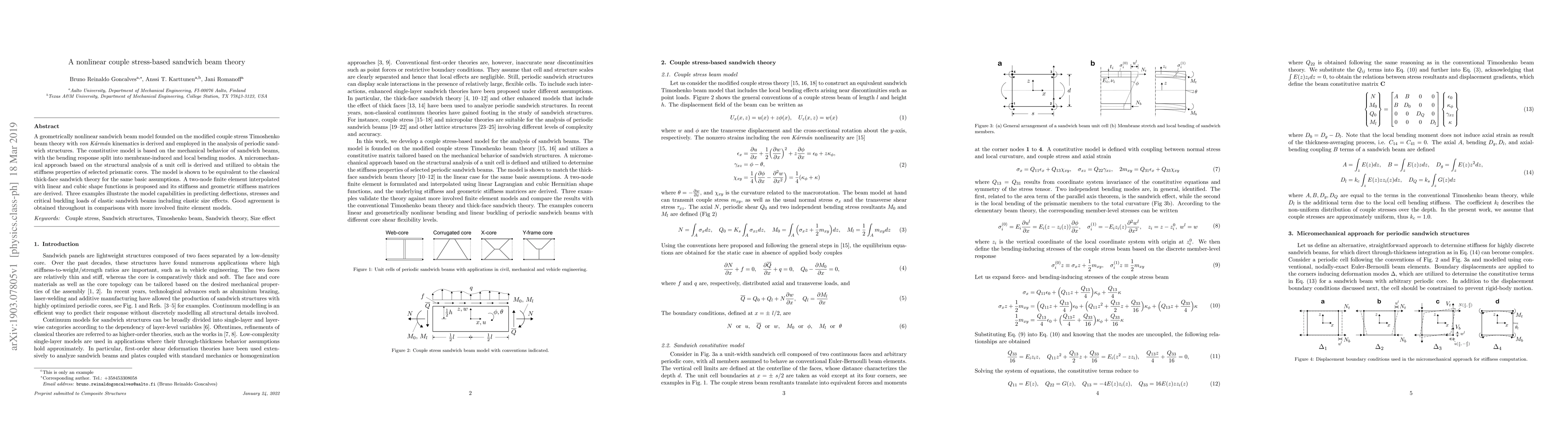 This paper develops a geometrically nonlinear sandwich beam theory based on modified couple stress Timoshenko theory, analyzing periodic sandwich structures. It demonstrates the model's accuracy in predicting deflections, stresses, and buckling loads, showing equivalence to classical thick-face sandwich theory under similar assumptions.
