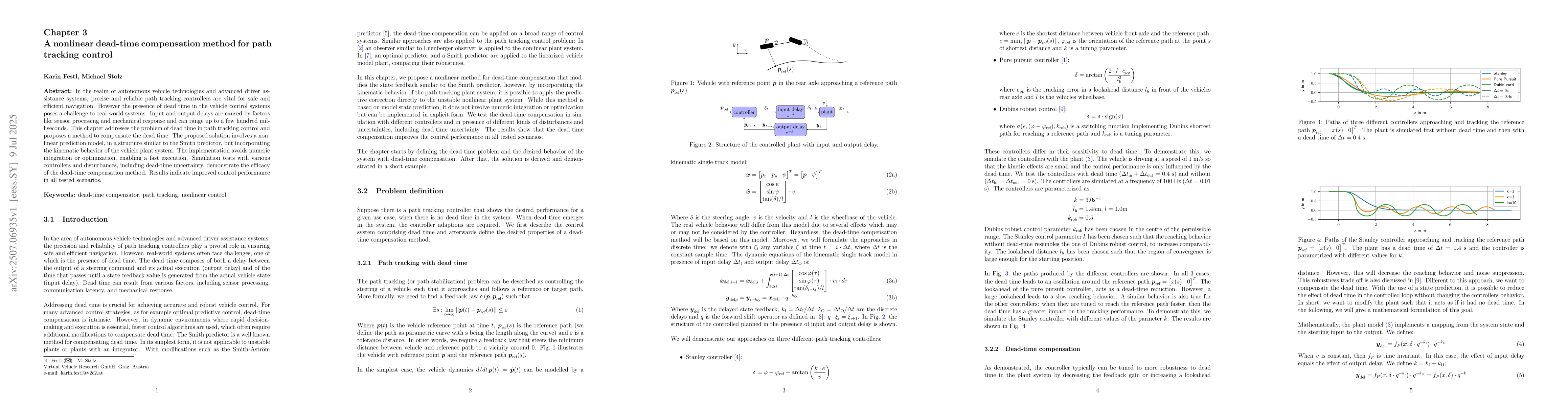 In the realm of autonomous vehicle technologies and advanced driver assistance systems, precise and reliable path tracking controllers are vital for safe and efficient navigation. However the presence of dead time in the vehicle control systems poses a challenge to real-world systems. Input and output delays are caused by factors like sensor processing and mechanical response and can range up to a few hundred milliseconds. This chapter addresses the problem of dead time in path tracking control and proposes a method to compensate the dead time. The proposed solution involves a nonlinear prediction model, in a structure similar to the Smith predictor, but incorporating the kinematic behavior of the vehicle plant system. The implementation avoids numeric integration or optimization, enabling a fast execution. Simulation tests with various controllers and disturbances, including dead-time uncertainty, demonstrate the efficacy of the dead-time compensation method. Results indicate improved control performance in all tested scenarios.