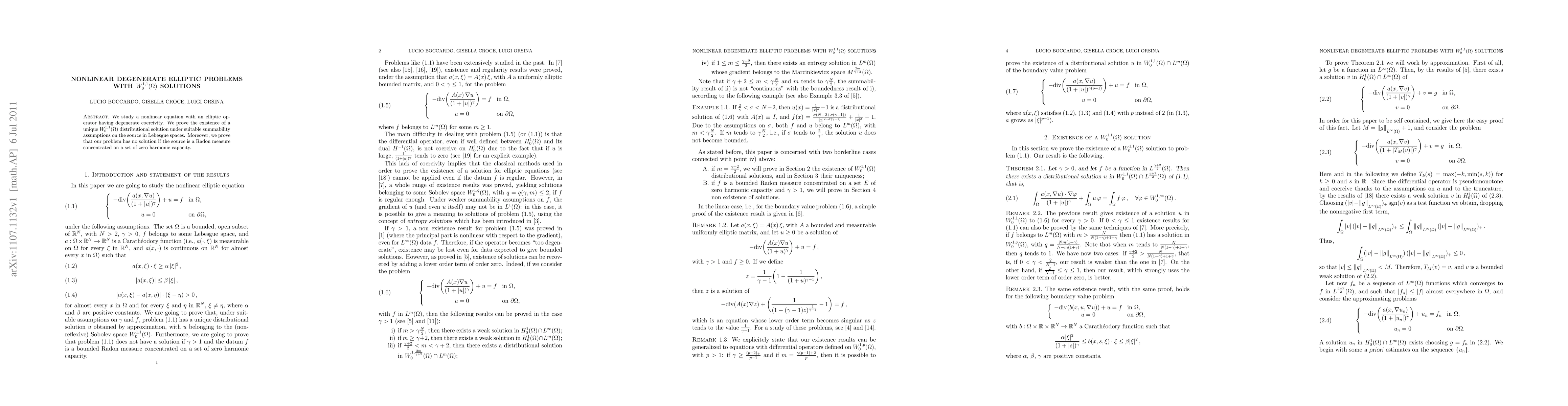 This paper investigates a nonlinear degenerate elliptic equation and establishes the existence of a unique W^{1,1}_0 solution under specific summability conditions on the source term. It also demonstrates the nonexistence of solutions when the source term is a Radon measure on a set of zero harmonic capacity.
