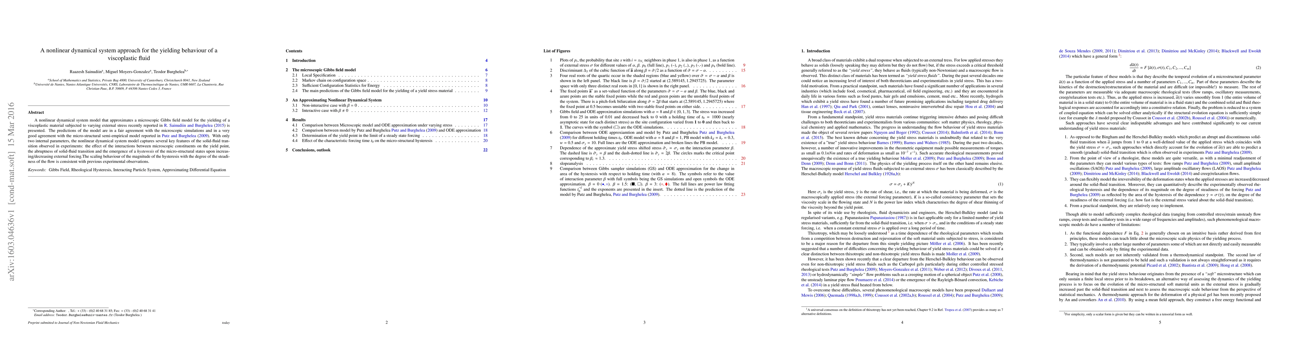 A nonlinear dynamical system model that approximates a microscopic Gibbs field model for the yielding of a viscoplastic material subjected to varying external stress recently reported in [1] is presented. The predictions of the model are in a fair agreement with the microscopic simulations and in a very good agreement with the microstructural semi-empirical model reported in [2]. With only two internal parameters, the nonlinear dynamical system model captures several key features of the solid-fluid transition observed in experiments: the effect of the interactions between microscopic constituents on the yield point, the abruptness of solid-fluid transition and the emergence of a hysteresis of the micro-structural states upon increasing/decreasing external forcing.The scaling behaviour of the magnitude of the hysteresis with the degree of the steadiness of the flow is consistent with previous experimental observations.