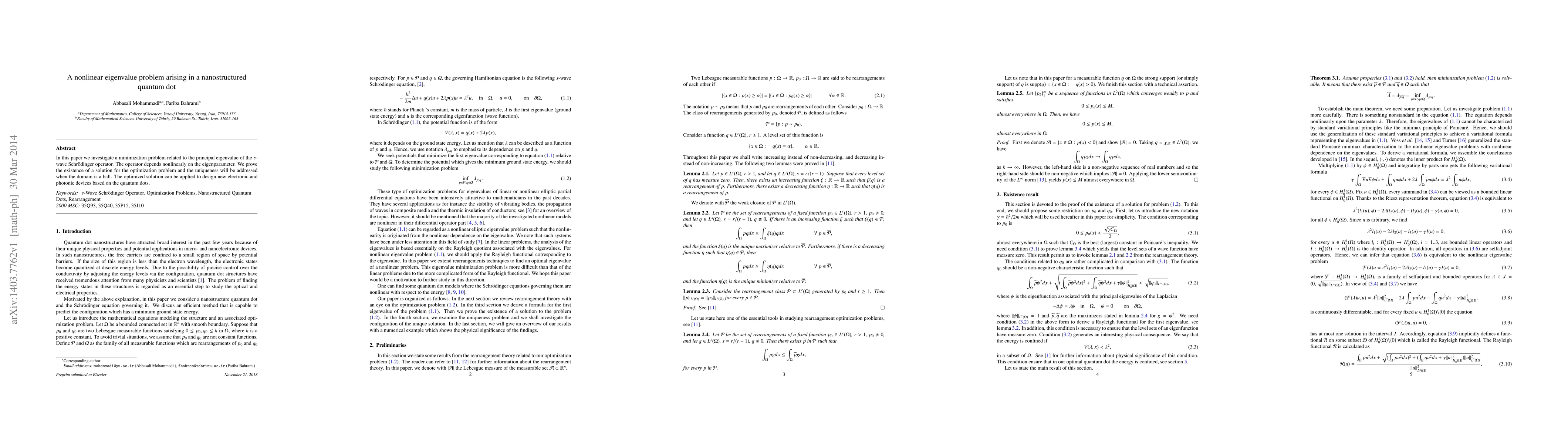 In this paper we investigate a minimization problem related to the principal eigenvalue of the $s$-wave Schr\"{o}dinger operator. The operator depends nonlinearly on the eigenparameter. We prove the existence of a solution for the optimization problem and the uniqueness will be addressed when the domain is a ball. The optimized solution can be applied to design new electronic and photonic devices based on the quantum dots.