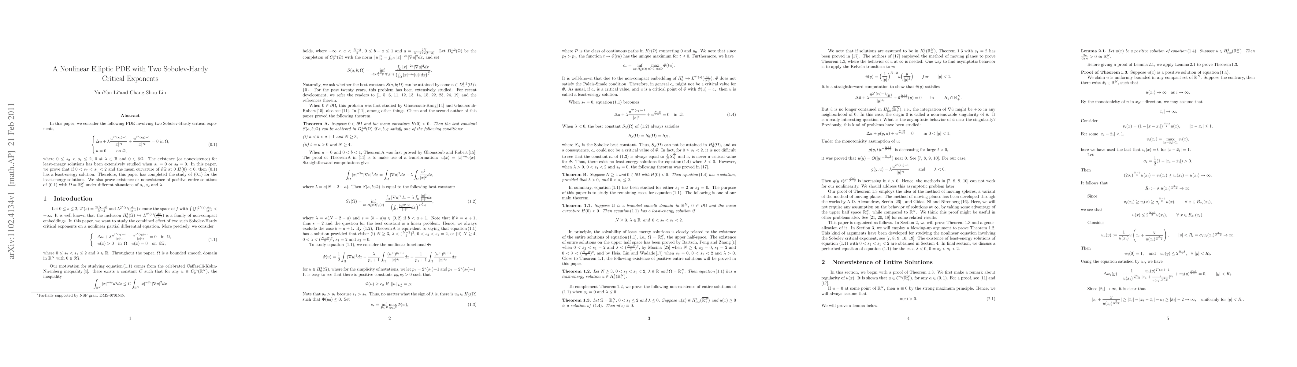 In this paper, we consider the following PDE involving two Sobolev-Hardy critical exponents, \label{0.1} {& \Delta u + \lambda\frac{u^{2^*(s_1)-1}}{|x|^{s_1}} + \frac{u^{2^*(s_2)-1}}{|x|^{s_2}} =0 \text{in} \Omega, & u=0 \qquad \text{on} \Omega, where $0 \le s_2 < s_1 \le 2$, $0 \ne \lambda \in \Bbb R$ and $0 \in \partial \Omega$. The existence (or nonexistence) for least-energy solutions has been extensively studied when $s_1=0$ or $s_2=0$. In this paper, we prove that if $0< s_2 < s_1 <2$ and the mean curvature of $\partial \Omega$ at 0 $H(0)<0$, then \eqref{0.1} has a least-energy solution. Therefore, this paper has completed the study of \eqref{0.1} for the least-energy solutions. We also prove existence or nonexistence of positive entire solutions of \eqref{0.1} with $\Omega =\rn$ under different situations of $s_1, s_2$ and $\lambda$.