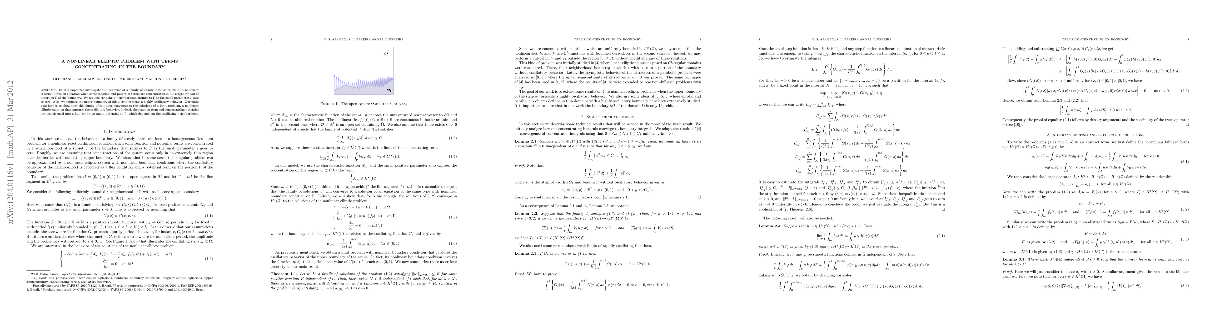 In this paper we investigate the behavior of a family of steady state solutions of a nonlinear reaction diffusion equation when some reaction and potential terms are concentrated in a $\epsilon$-neighborhood of a portion $\Gamma$ of the boundary. We assume that this $\epsilon$-neighborhood shrinks to $\Gamma$ as the small parameter $\epsilon$ goes to zero. Also, we suppose the upper boundary of this $\epsilon$-strip presents a highly oscillatory behavior. Our main goal here is to show that this family of solutions converges to the solutions of a limit problem, a nonlinear elliptic equation that captures the oscillatory behavior. Indeed, the reaction term and concentrating potential are transformed into a flux condition and a potential on $\Gamma$, which depends on the oscillating neighborhood.