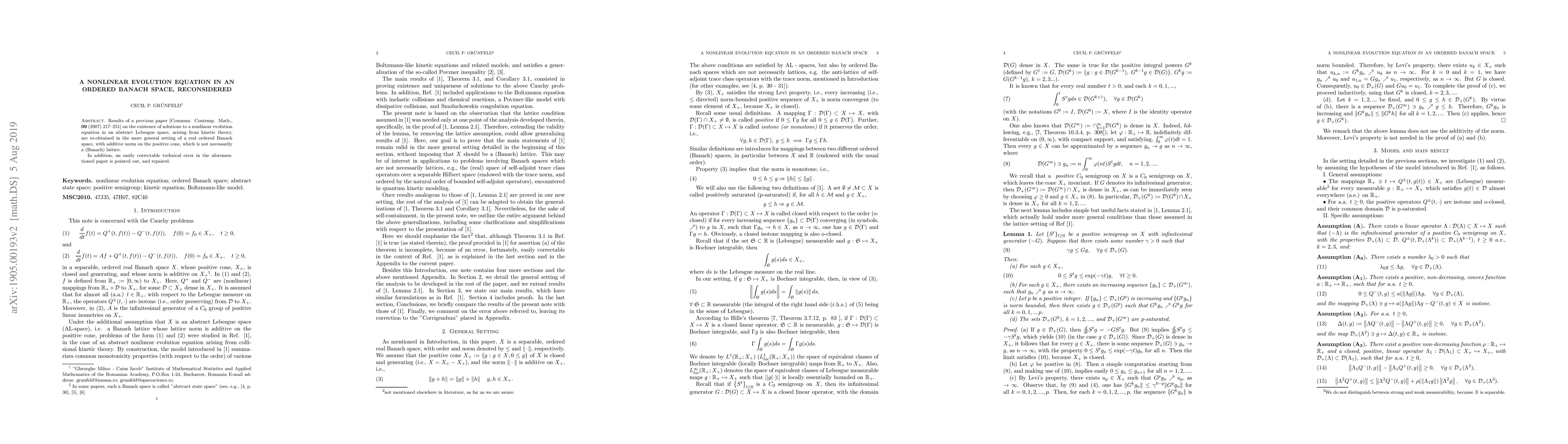Results of a previous paper [Commun. Contemp. Math., 09 (2007) 217-251] on the existence of solutions to a nonlinear evolution equation in an abstract Lebesgue space, arising from kinetic theory, are re-obtained in the more general setting of a real ordered Banach space, with additive norm on the positive cone, which is not necessarily a (Banach) lattice. In addition, an easily correctable technical error in the aforementioned paper is pointed out, and repaired.